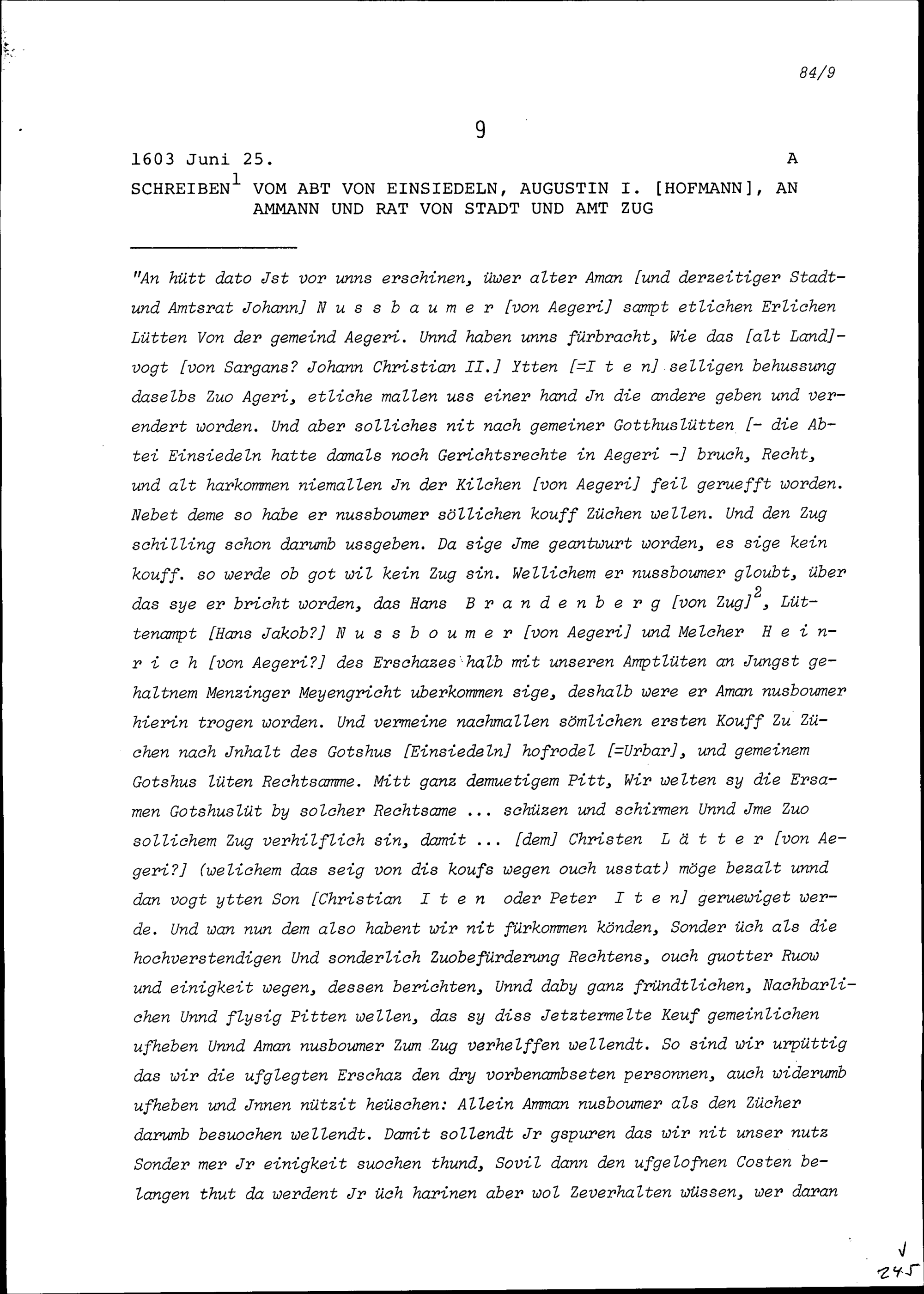 Schreiben von Augustin I. Hofmann, Abt von Einsiedeln, an Ammann und Rat von Stadt und Amt Zug