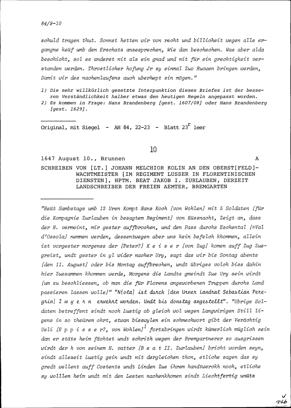 Schreiben von Johann Melchior Kolin, Leutnant, an Beat Jakob I. Zurlauben, Oberstfeldwachtmeister im Regiment Lusser in florentinischen Diensten und Landschreiber der Freien Ämter, Bremgarten