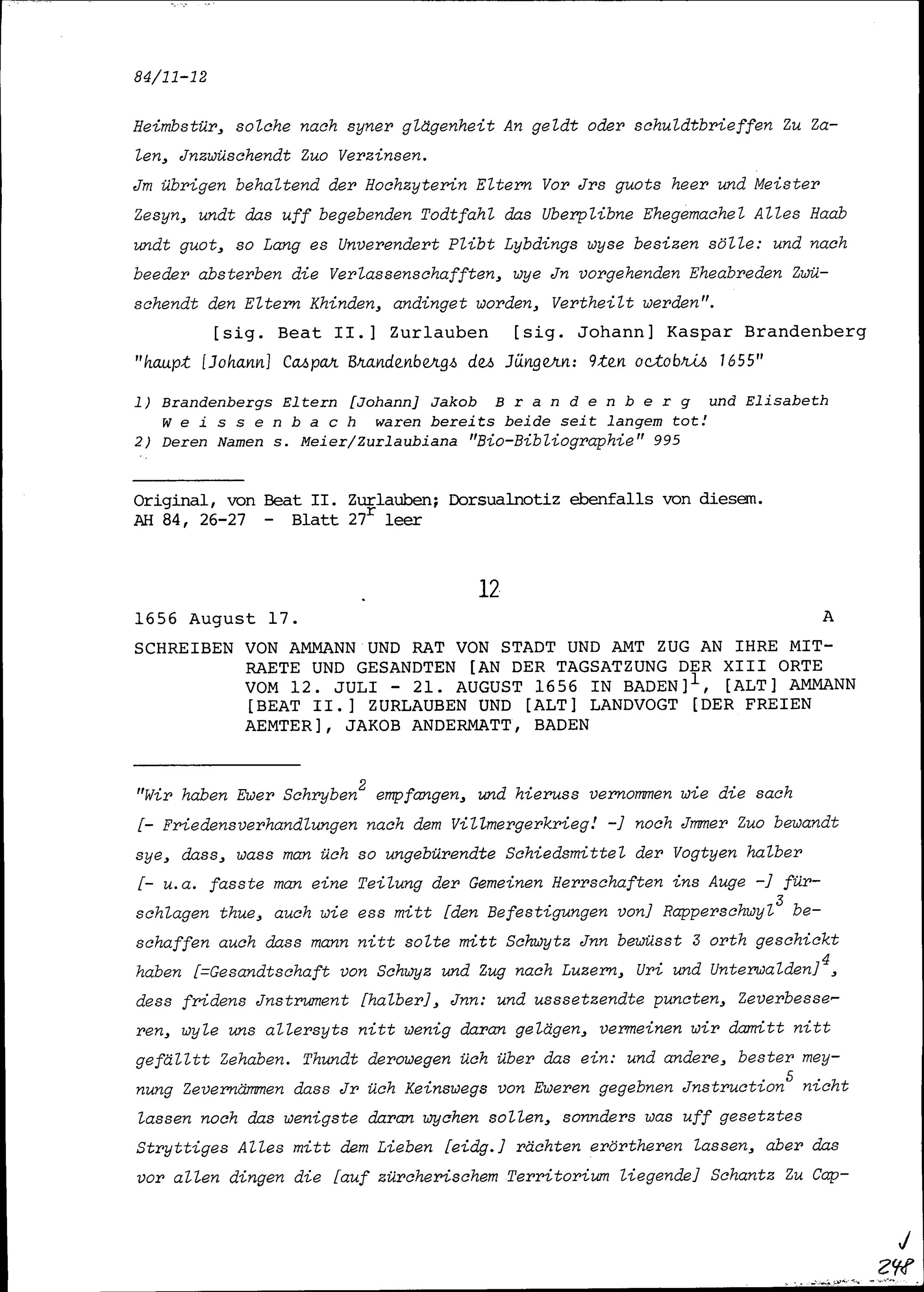 Schreiben des Ammanns und Rats von Stadt und Amt Zug an Beat II. Zurlauben, Altammann, und an Jakob Andermatt, Altlandvogt der Freien Ämter, beide Tagsatzungsgesandte in Baden