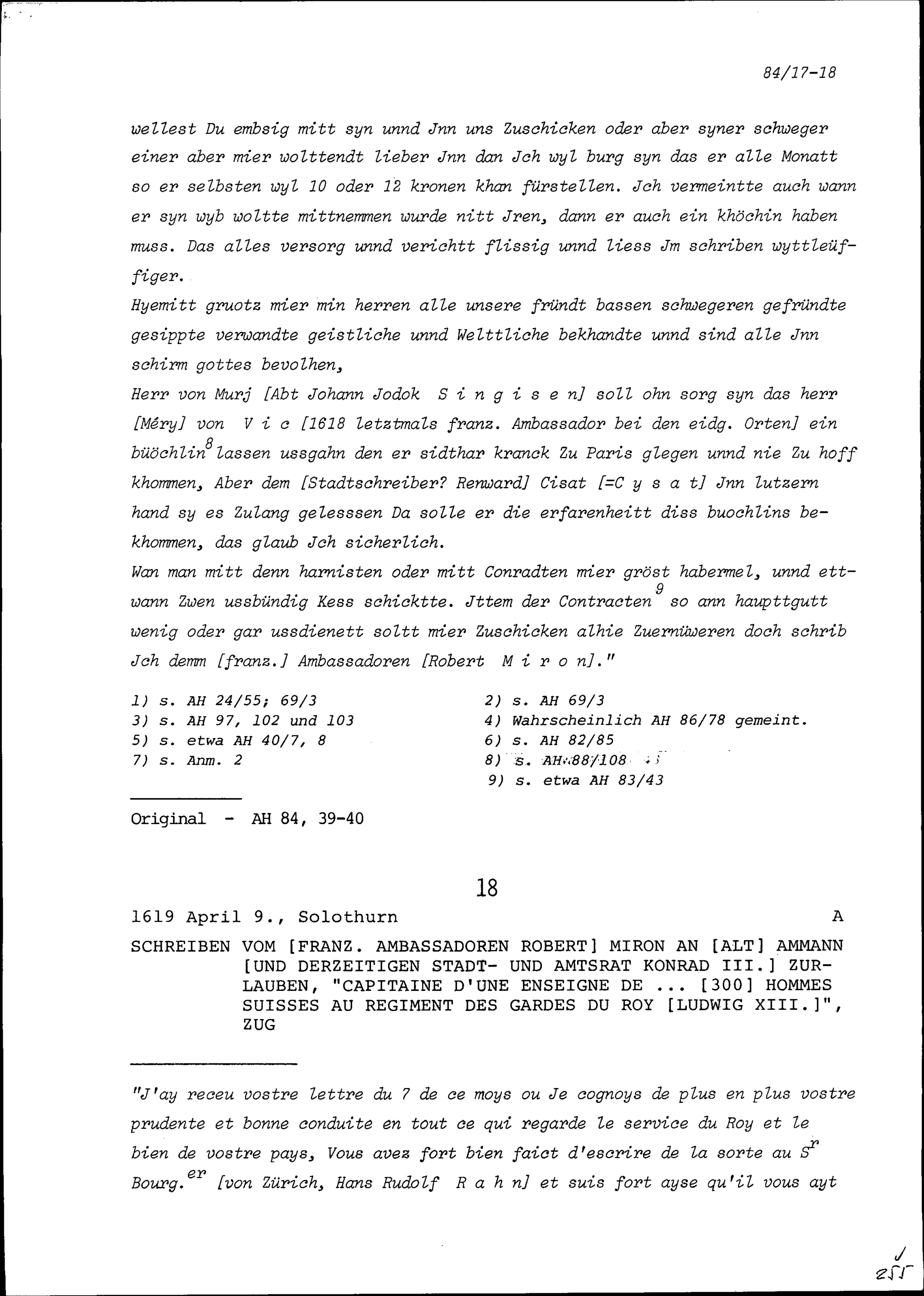 Schreiben von Robert Miron, Ambassador von Frankreich, an Konrad III. Zurlauben,...