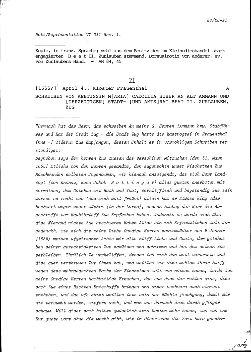 Schreiben von Maria Cäcilia Huber, Äbtissin, an Beat II. Zurlauben, Altammann und Stadt- und Amtrat, Zug
