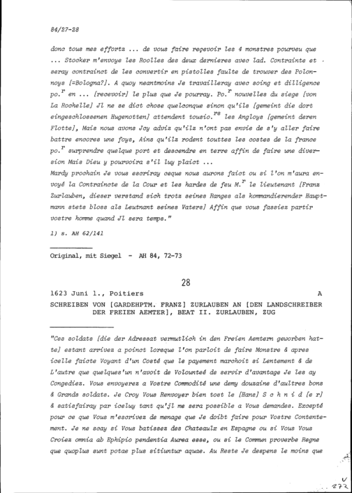 Schreiben von Franz Zurlauben, Gardehauptmann, an Beat II. Zurlauben, Landschreiber...
