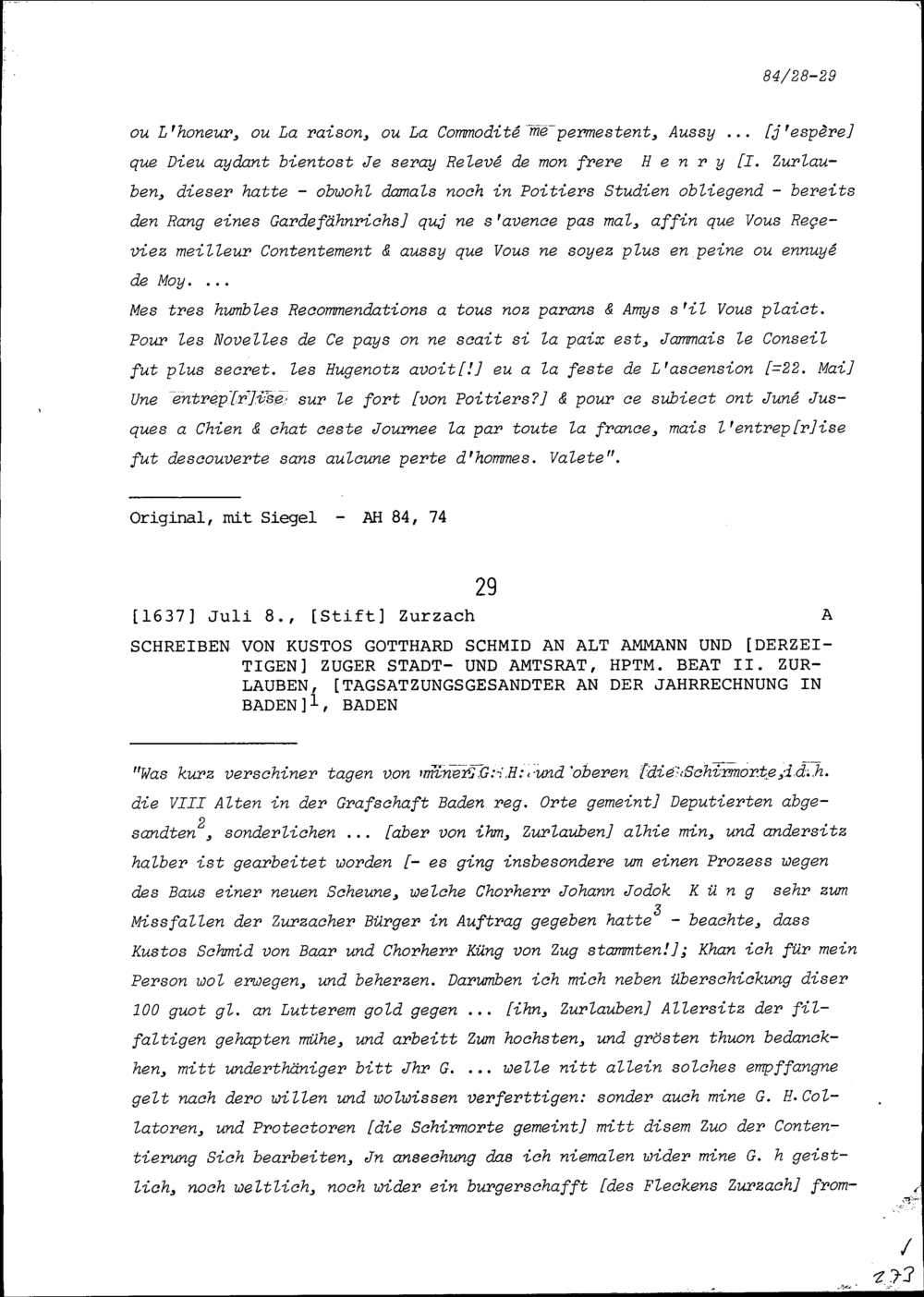 Schreiben von Gotthard Schmid, Kustos, an Beat II. Zurlauben, Stadt- und Amtrat Zug, Hauptmann und Tagsatzungsgesandter an der Jahrrechnung in Baden, Baden