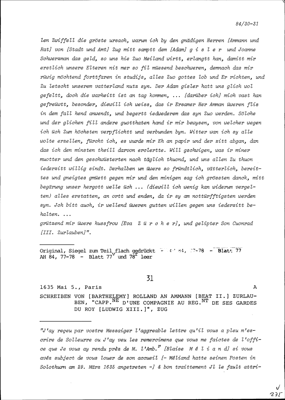 Schreiben von Barthélémy Rolland an Beat II. Zurlauben, Ammann und Hauptmann, Zu...