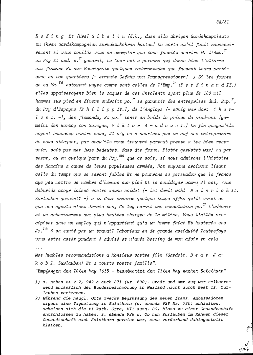 Schreiben von Barthélémy Rolland an Beat II. Zurlauben, Ammann und Hauptmann, Zu...