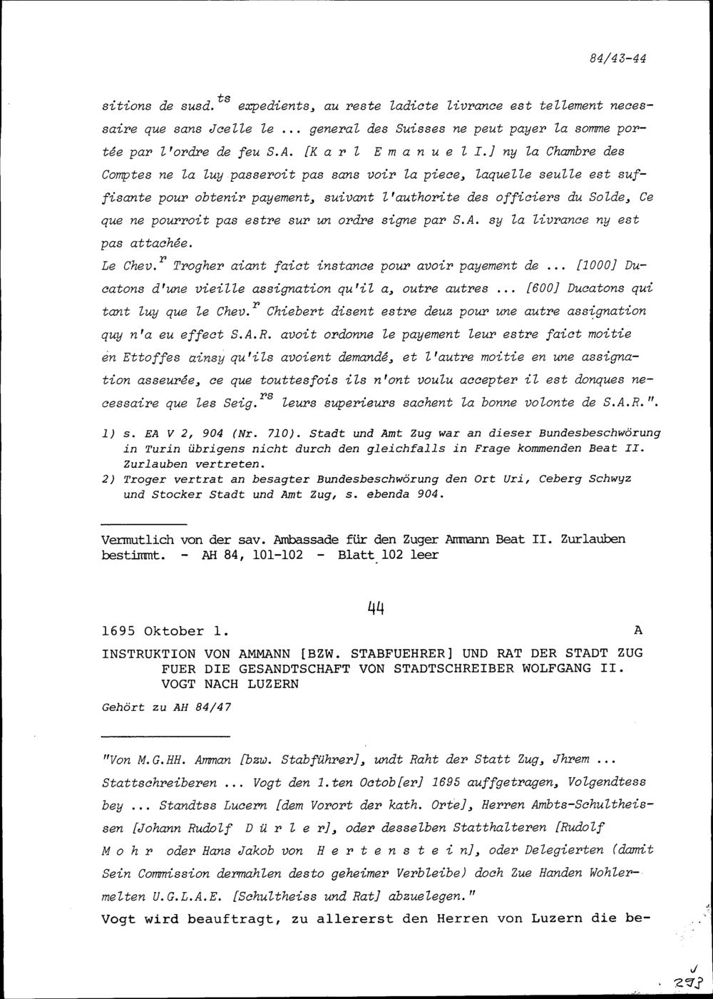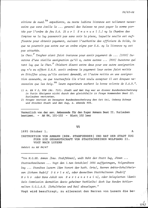 Instruktion des Ammanns (Stabführers) und Rats der Stadt Zug für die Gesandtschaft...