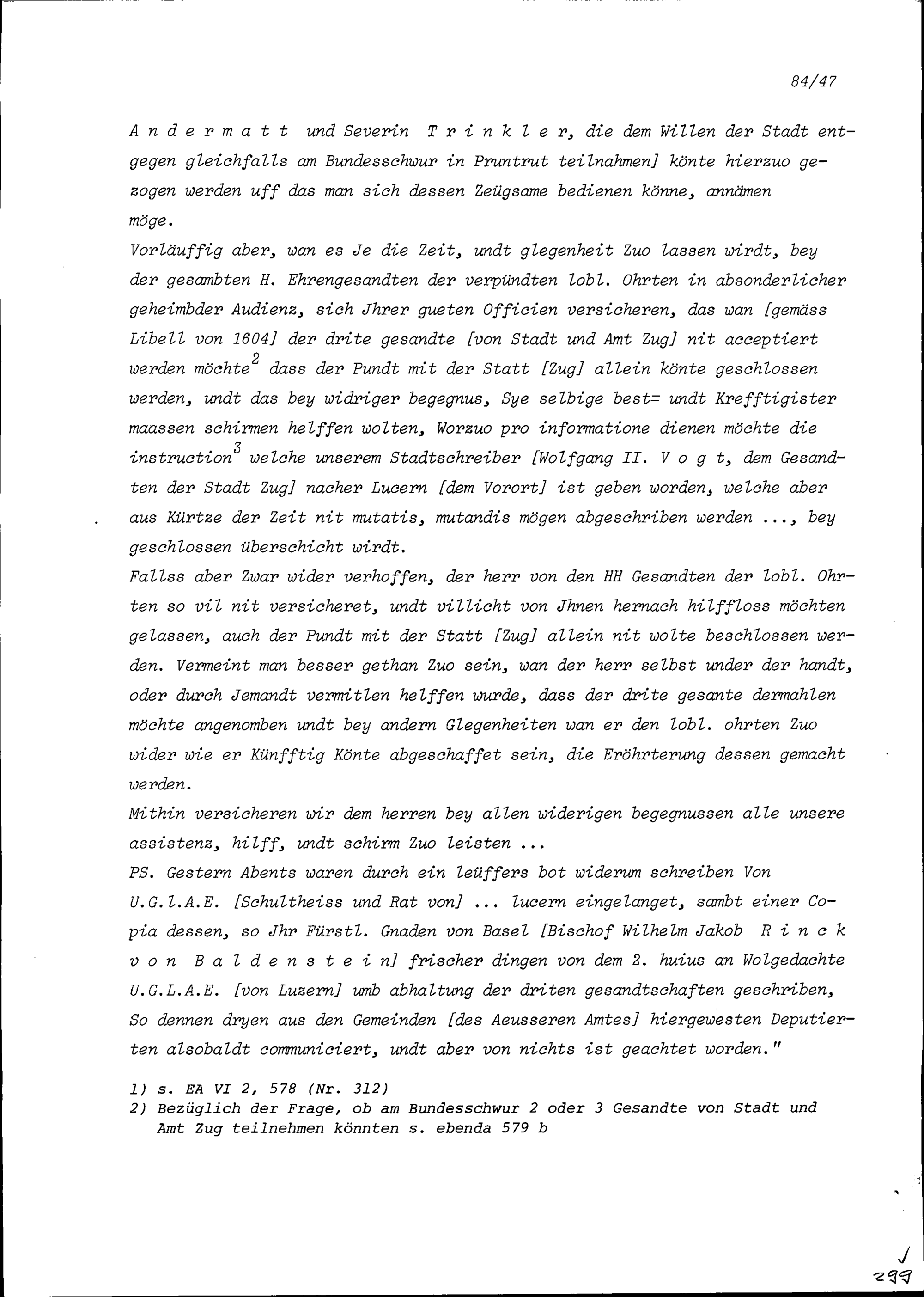 Schreiben des Statthalters, Rats und der Bürger der Stadt Zug an Beat Kaspar Zurlauben, Gesandter in Pruntrut, Hauptmann, Ammann und Stadt- und Amtrat