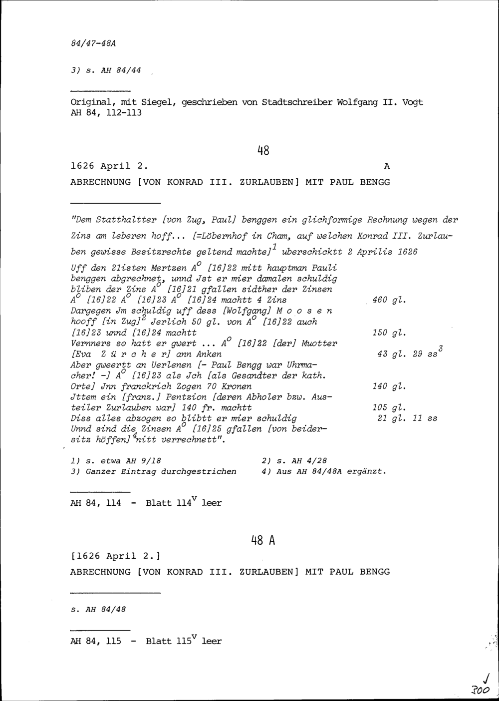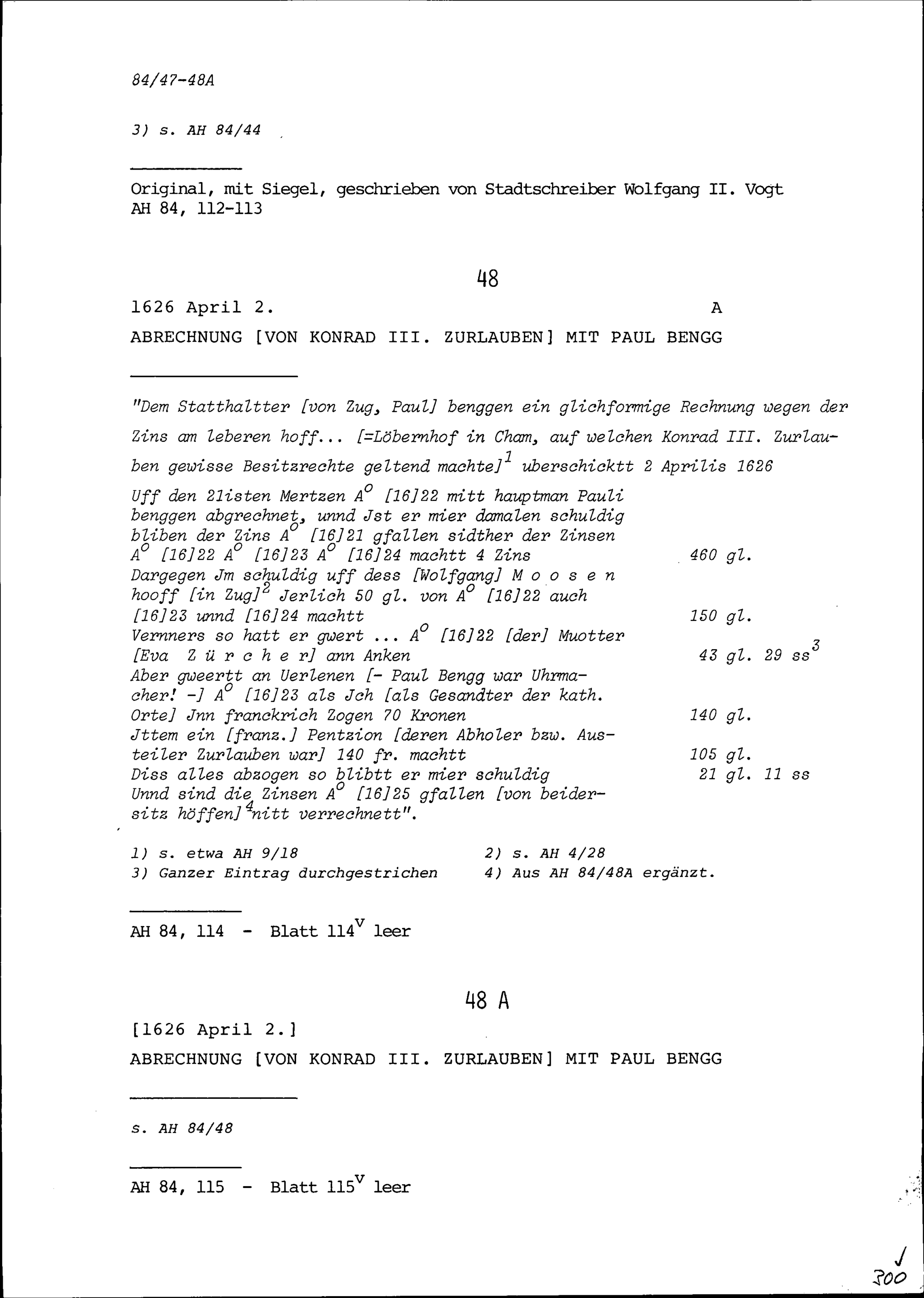 Abrechnung von Konrad III. Zurlauben mit Paul Bengg, Statthalter von Zug und Hauptmann,