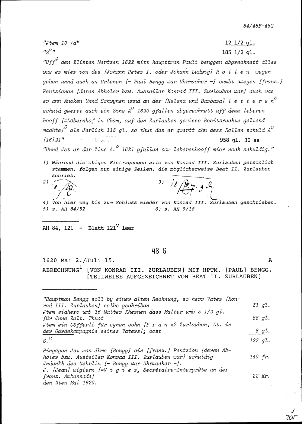 Abrechnung von Konrad III. Zurlauben mit Paul Bengg, Statthalter von Zug und Hauptmann, teilweise aufgezeichnet von Beat II. Zurlauben