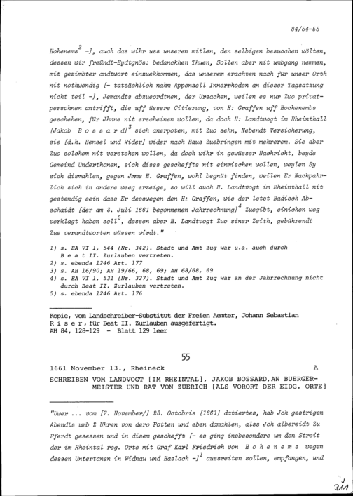 Schreiben von Jakob Bossard, Landvogt im Rheintal, an Bürgermeister und Rat Zürich, Vorort der Eidgenössischen Orte