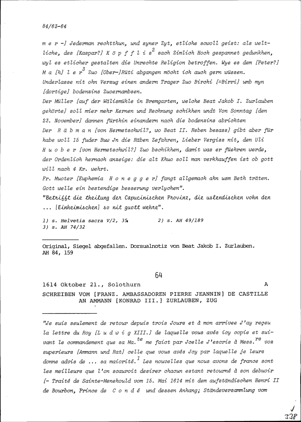 Schreiben von Pierre Jeannin de Castille, Ambassador von Frankreich, an Konrad III. Zurlauben, Ammann, Zug
