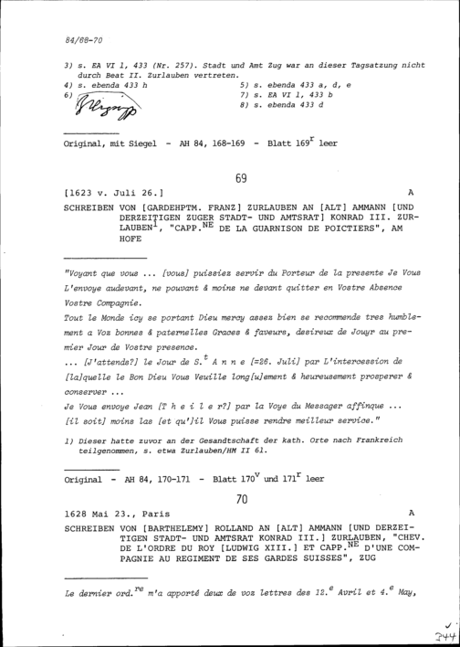 Schreiben von Franz Zurlauben, Gardehauptmann, an Konrad III. Zurlauben, Altammann und Stadt- und Amtrat Zug sowie Hauptmann in der Garnison Poitier, am Hof in Paris