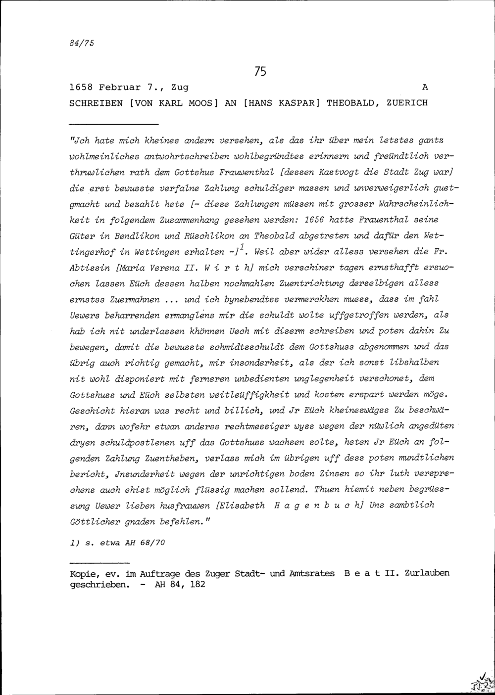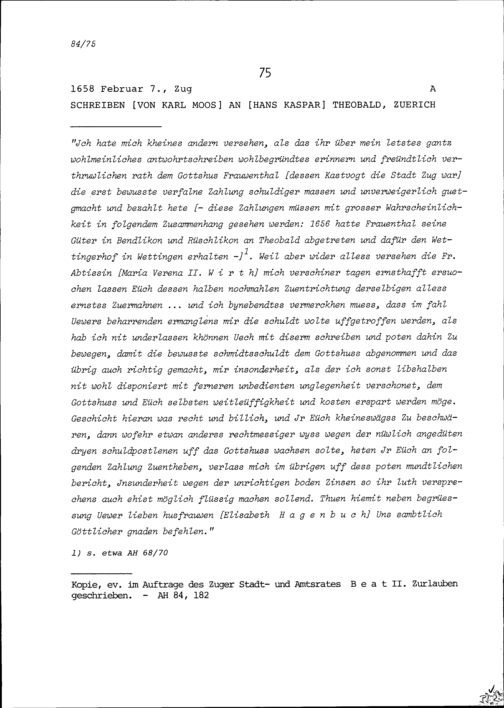 Schreiben von Karl Moos an Hans Kaspar Theobald, Zürich