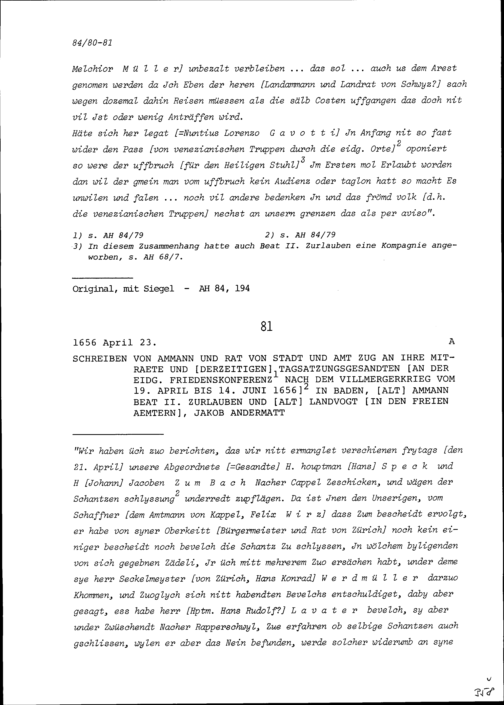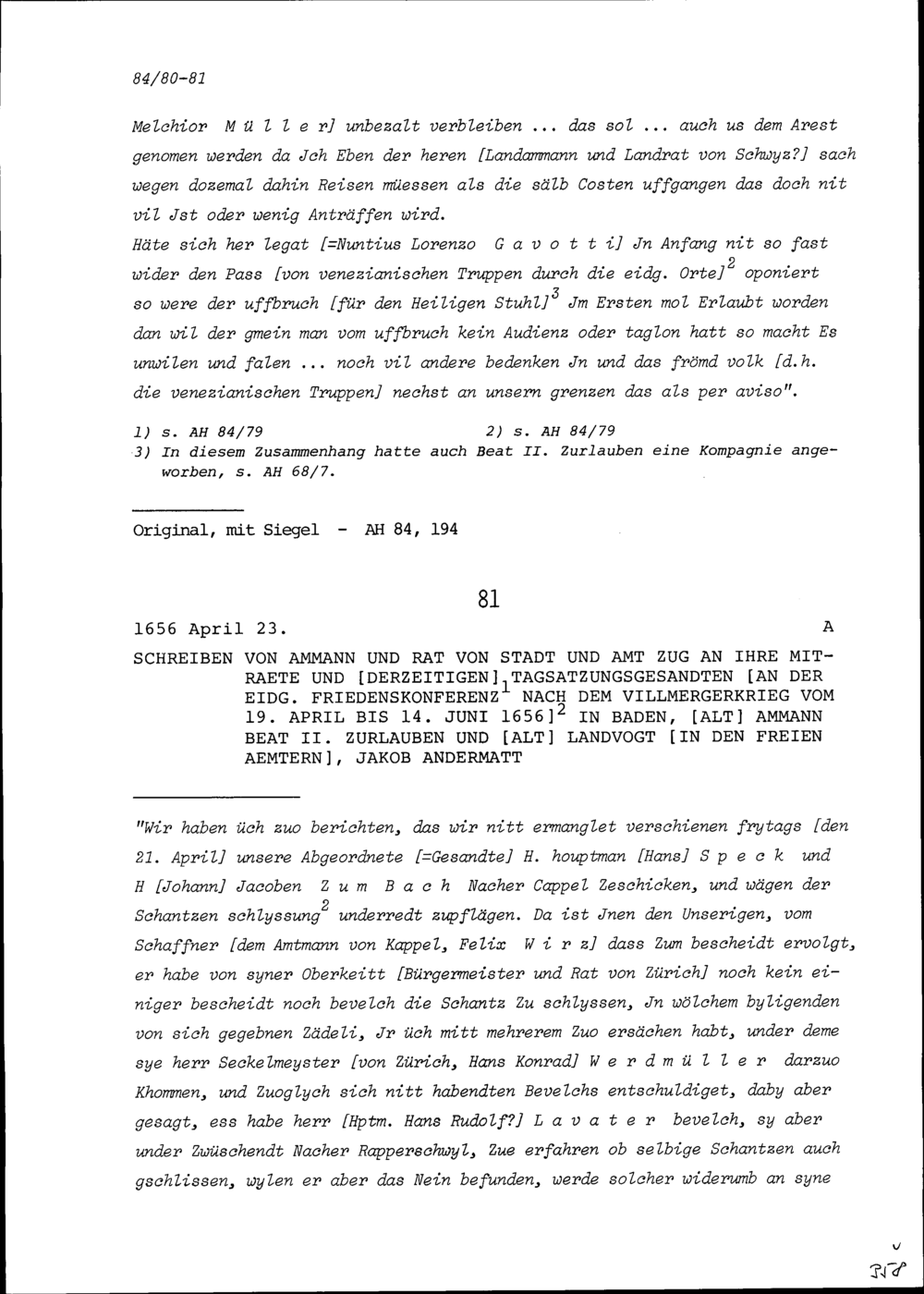 Schreiben des Ammanns und Rats von Stadt und Amt Zug an Beat II. Zurlauben, Stadt- und Amtrat und Tagsatzungsgesandter, und an Jakob Andermatt, Stadt- und Amtrat und Tagsatzungsgesandter, an der Friedenskonferenz nach dem Villmergerkrieg vom 19. April bis 14. Juni 1656 in Baden