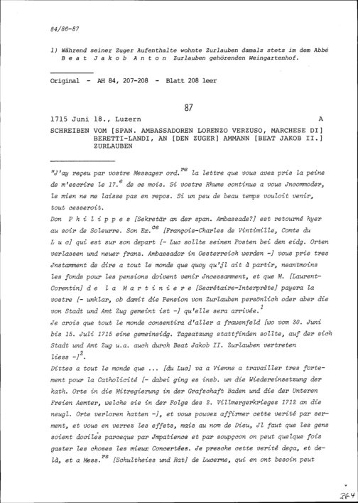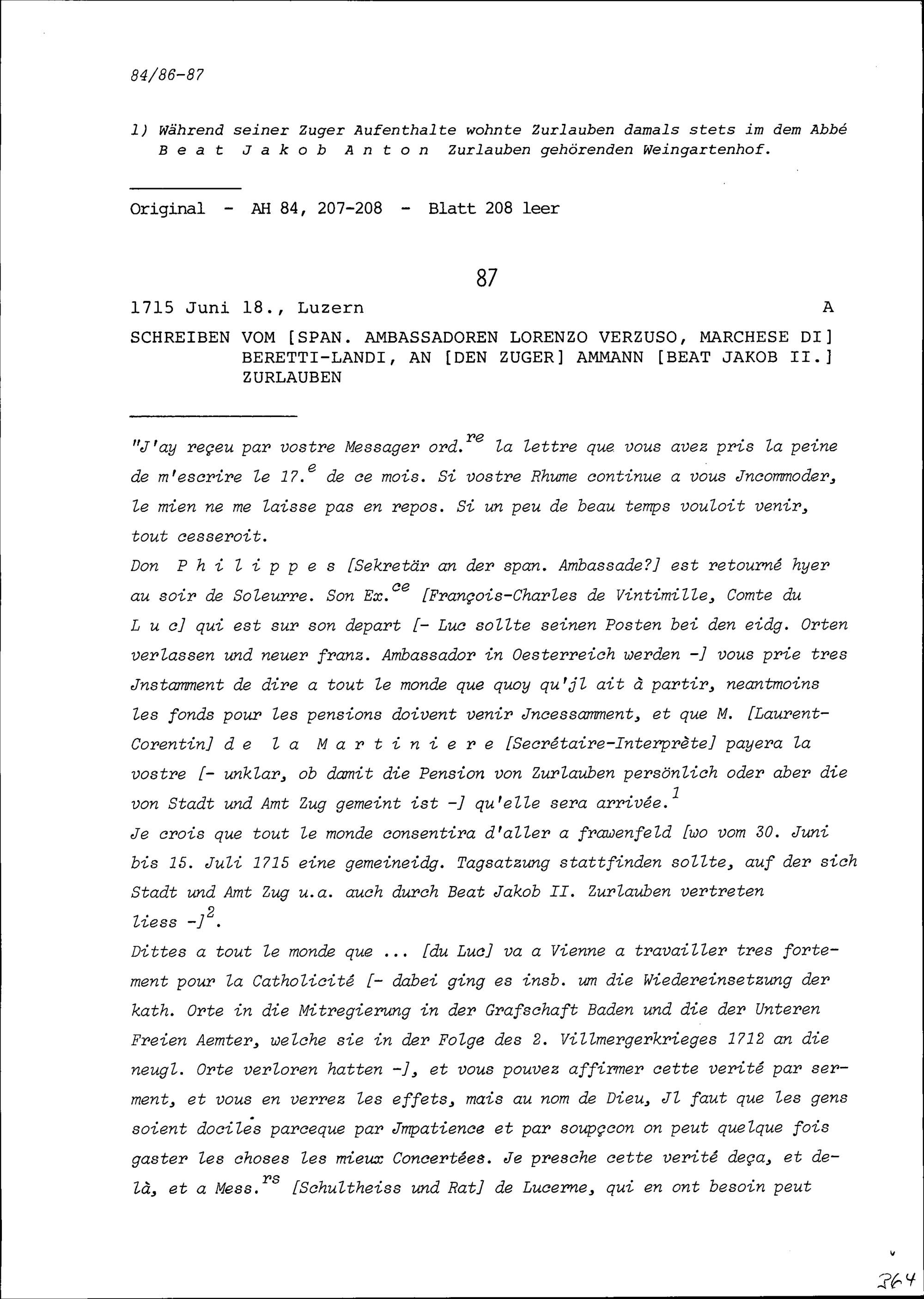 Schreiben von Lorenzo Verzuso, Marchese di Beretti-Landi, Ambassador von Spanien, an Beat Jakob II. Zurlauben, Ammann