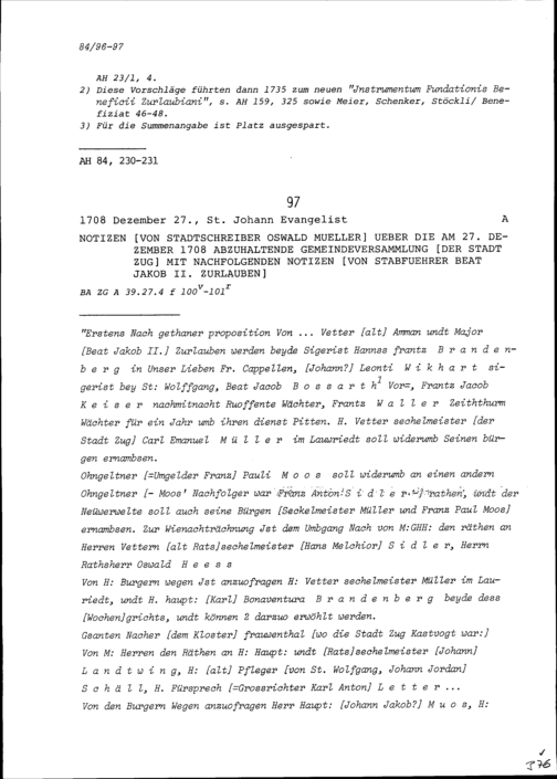 Notiz von Oswald Müller, Stadtschreiber über die am 27. Dezember 1708 abzuhaltende Gemeindeversammlung der Stadt Zug mit Ergänzung von Beat Jakob II. Zurlauben, Stabführer