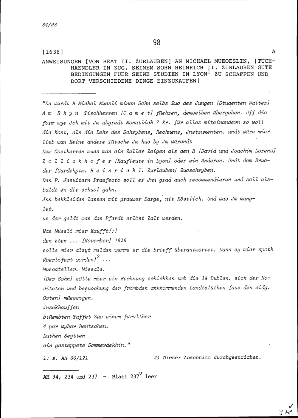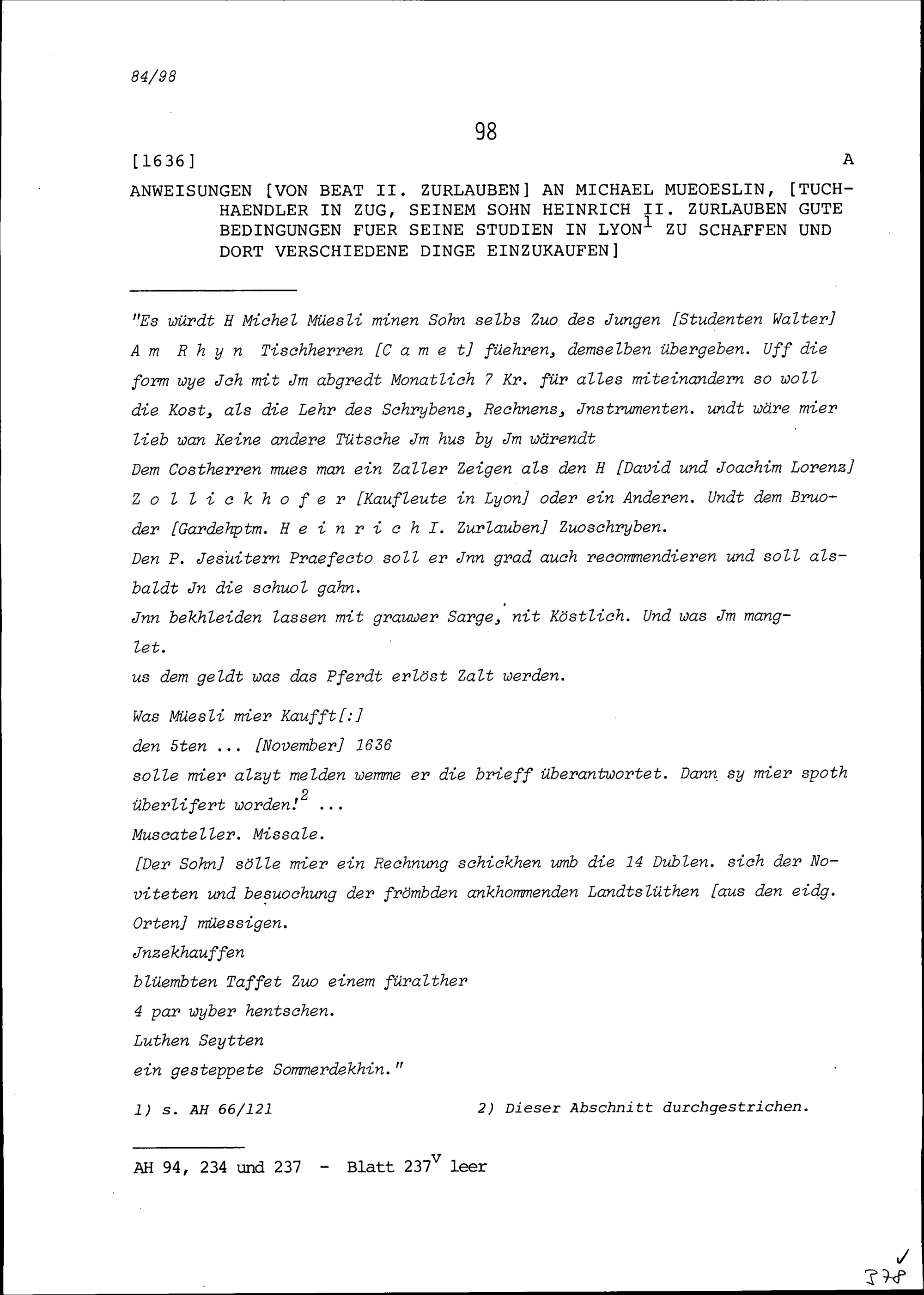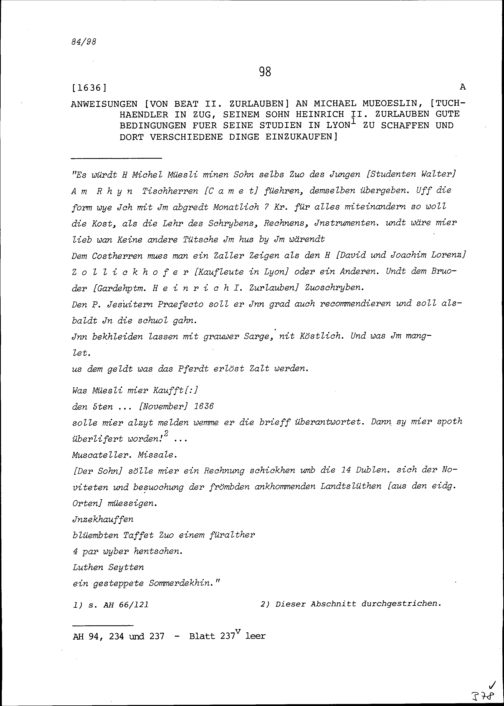 Anweisungen von Beat II. Zurlauben an Michael Müöslin, Tuchhändler in Zug, seinem Sohn Heinrich II. Zurlauben gute Bedingungen für seine Studien in Lyon zu schaffen und dort verschiedene Dinge einzukaufen