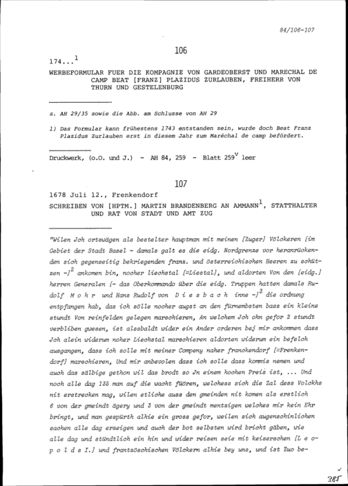 Werbeformular für die Kompanie von Beat Franz Plazidus Zurlauben, Gardeoberst und Feldmarschall