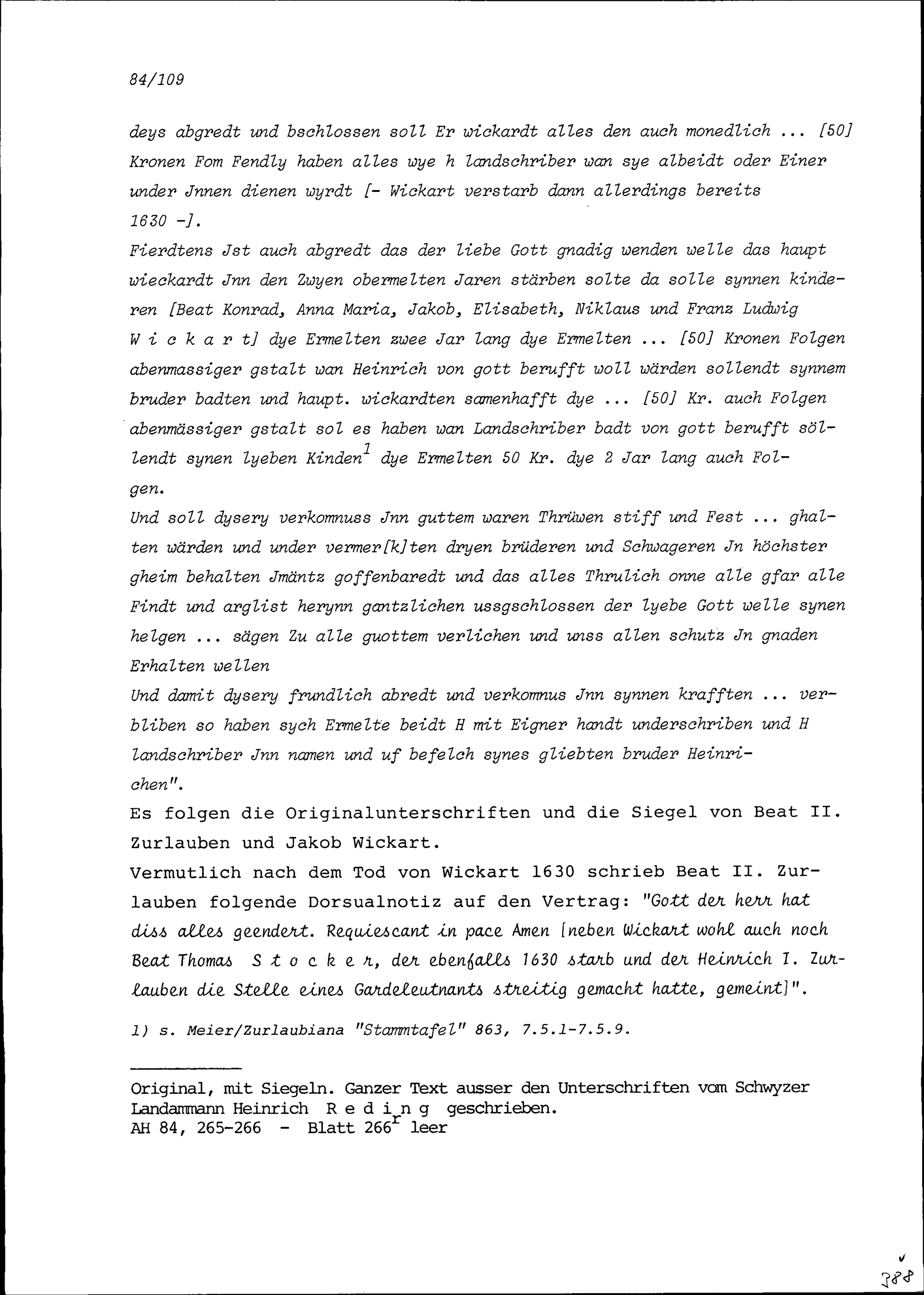 Vertrag zwischen Beat II. Zurlauben, Heinrich I. Zurlauben und Jakob Wickart, die...