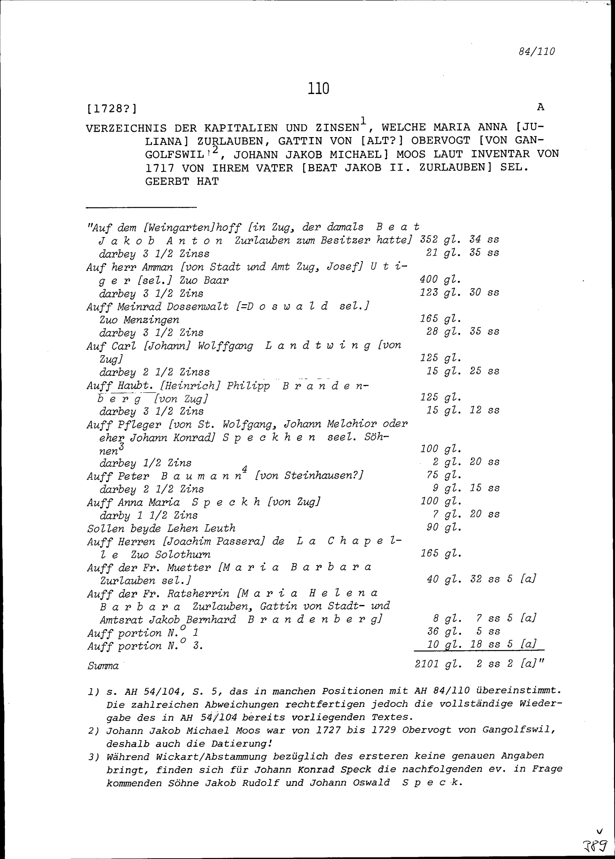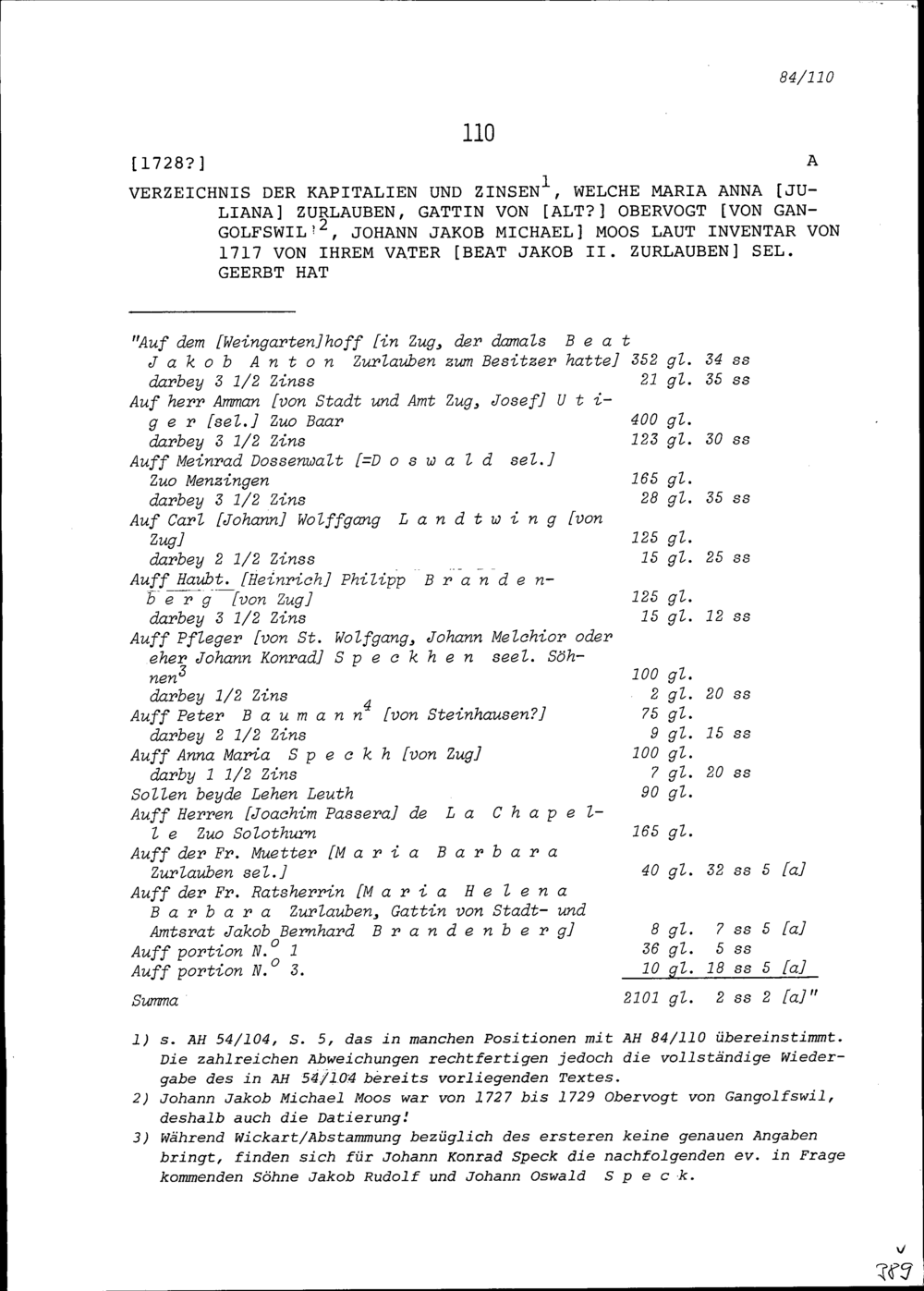 Verzeichnis der Kapitalien und Zinsen, welche Maria Anna Juliana Zurlauben, Gattin von Johann Jakob Michael Moos, Altobervogt von Gangolfswil, von Beat Jakob II. Zurlauben, selig, ihrem Vater, geerbt hat