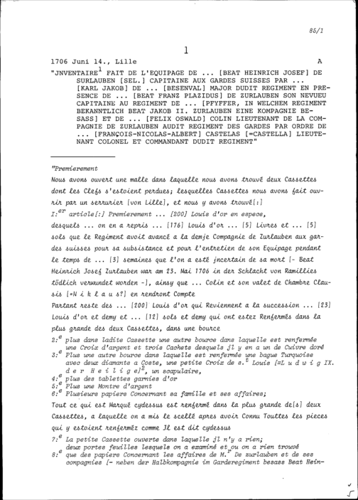 Inventar der Hinterlassenschaft von Beat Heinrich Josef Zurlauben, Gardehauptmann, aufgezeichnet von Karl Jakob von Besenval, Major, von Beat Franz Plazidus Zurlauben und von Felix Oswald Kolin, Leutnant, auf Anordnung von François-Nicolas-Albert Castella, Oberst