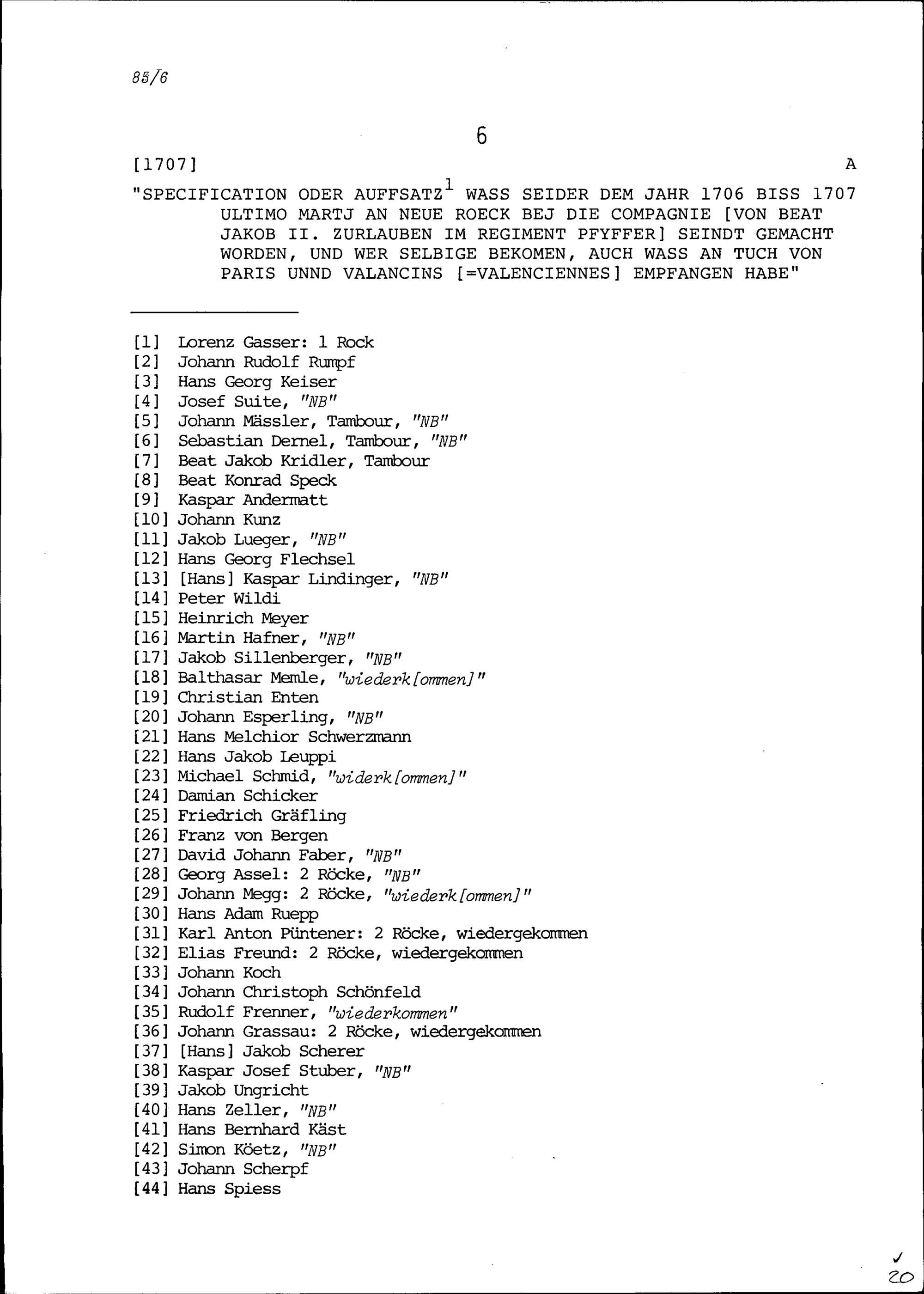 Soldaten der Kompanie von Beat Jakob II. Zurlauben im Regiment Pfyffer, die neue Röcke erhielten und den Vorrat an Tuch von Paris und Valenciennes