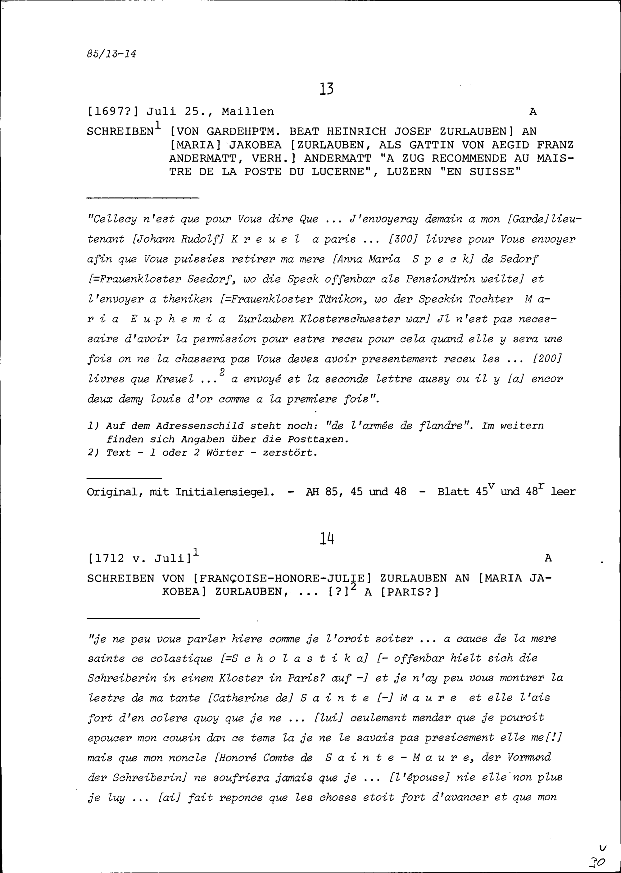 Schreiben von Beat Heinrich Josef Zurlauben, Gardehauptmann, an Maria Jakobea Zurlauben, Gattin von Ägid Franz Andermatt, Zug