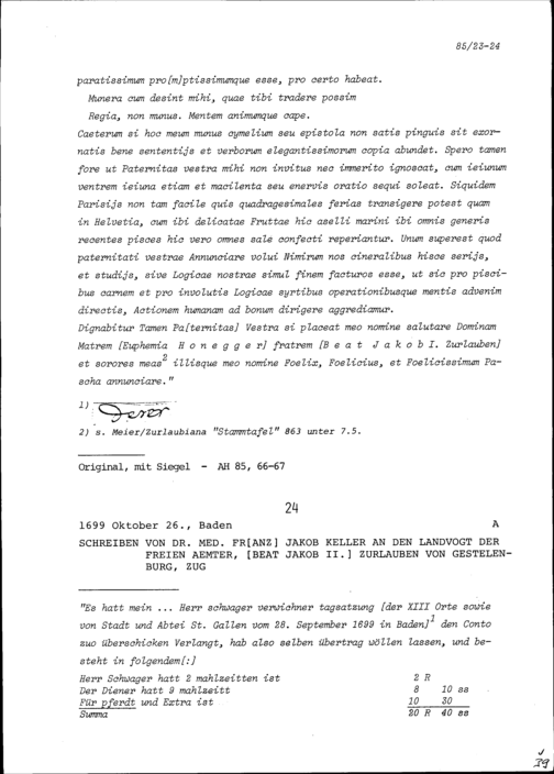 Schreiben von Franz Jakob Keller, Dr. med., an Beat Jakob II. Zurlauben, Landvogt der Freien Ämter, Zug