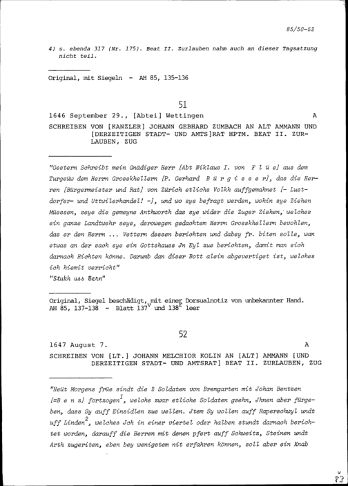 Schreiben von Johann Gebhard Zumbach, Kanzler, an Beat II. Zurlauben, Hauptmann und...