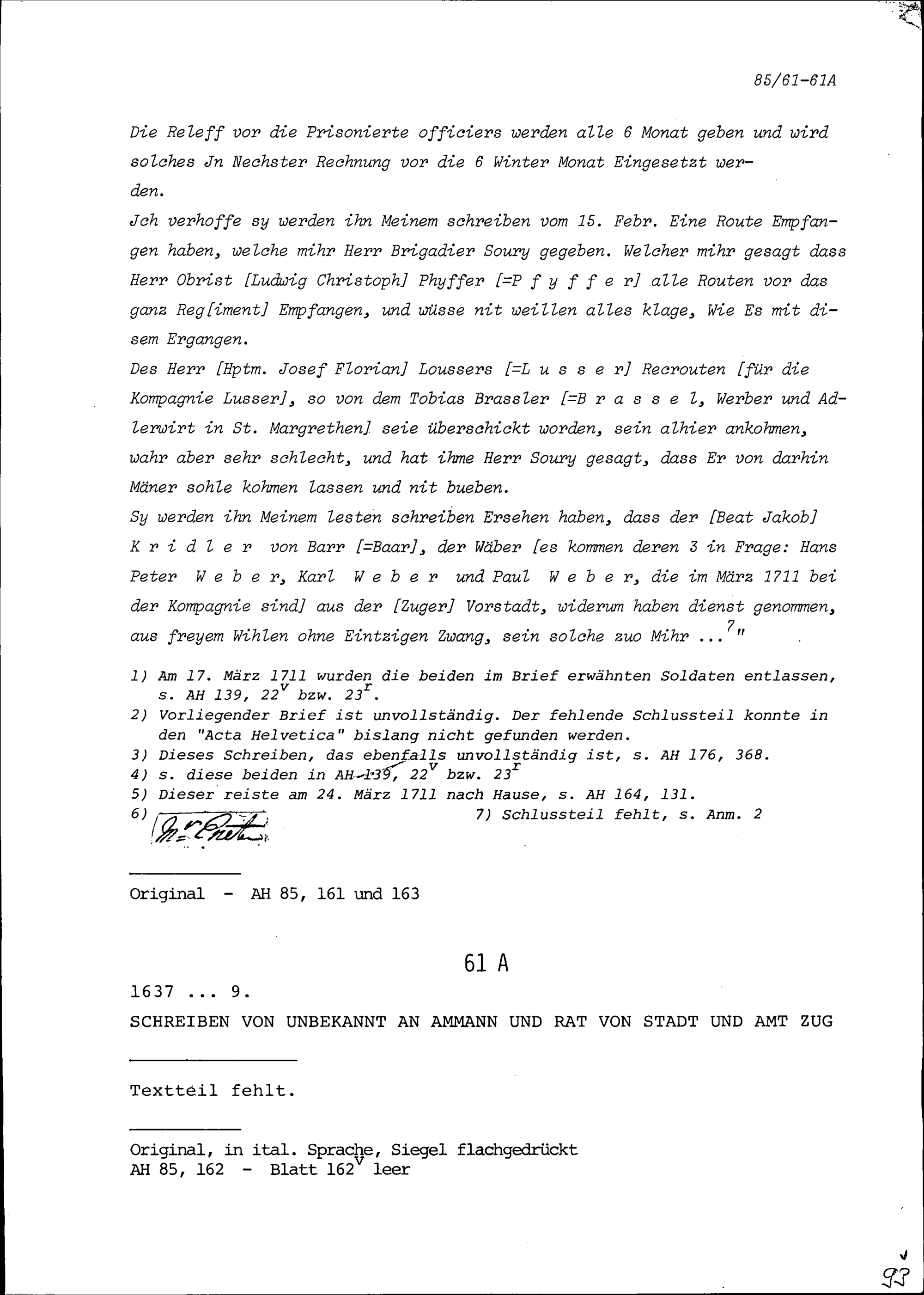 Schreiben von Unbekannt an Ammann und Rat von Stadt und Amt Zug