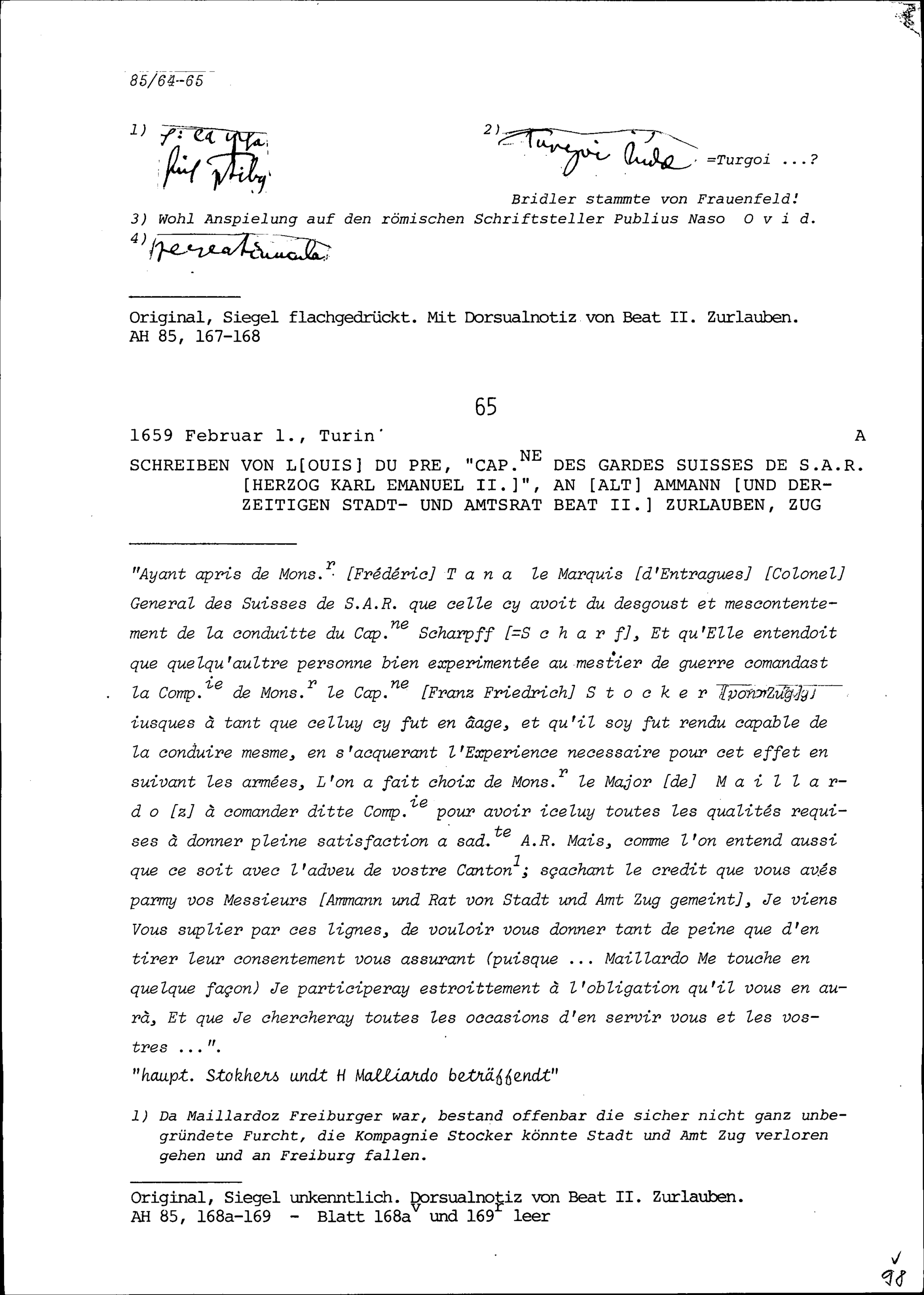 Schreiben von Louis du Pré, Hauptmann der Schweizer Garde Savoyens, an Beat II. Zurlauben, Altammann und Stadt- und Amtrat, Zug