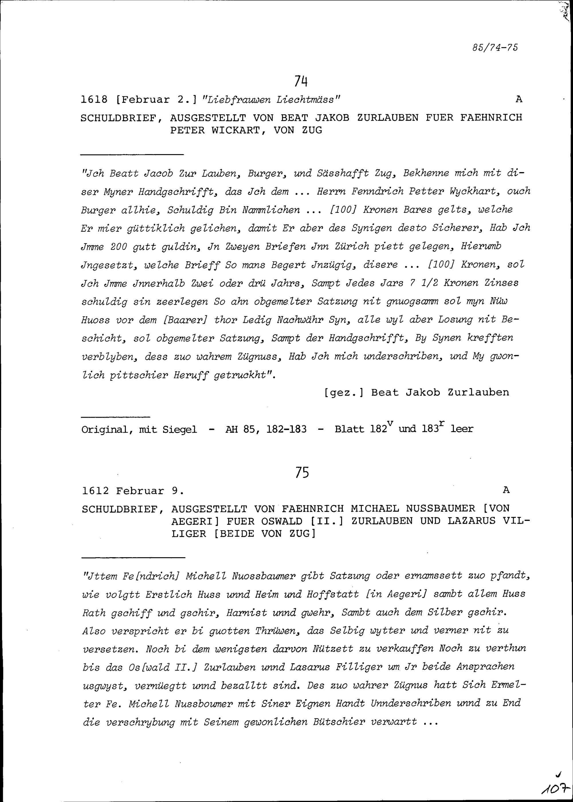 Schuldbrief, ausgestellt von Beat Jakob Zurlauben für Peter Wickart, Fähnrich, von Zug