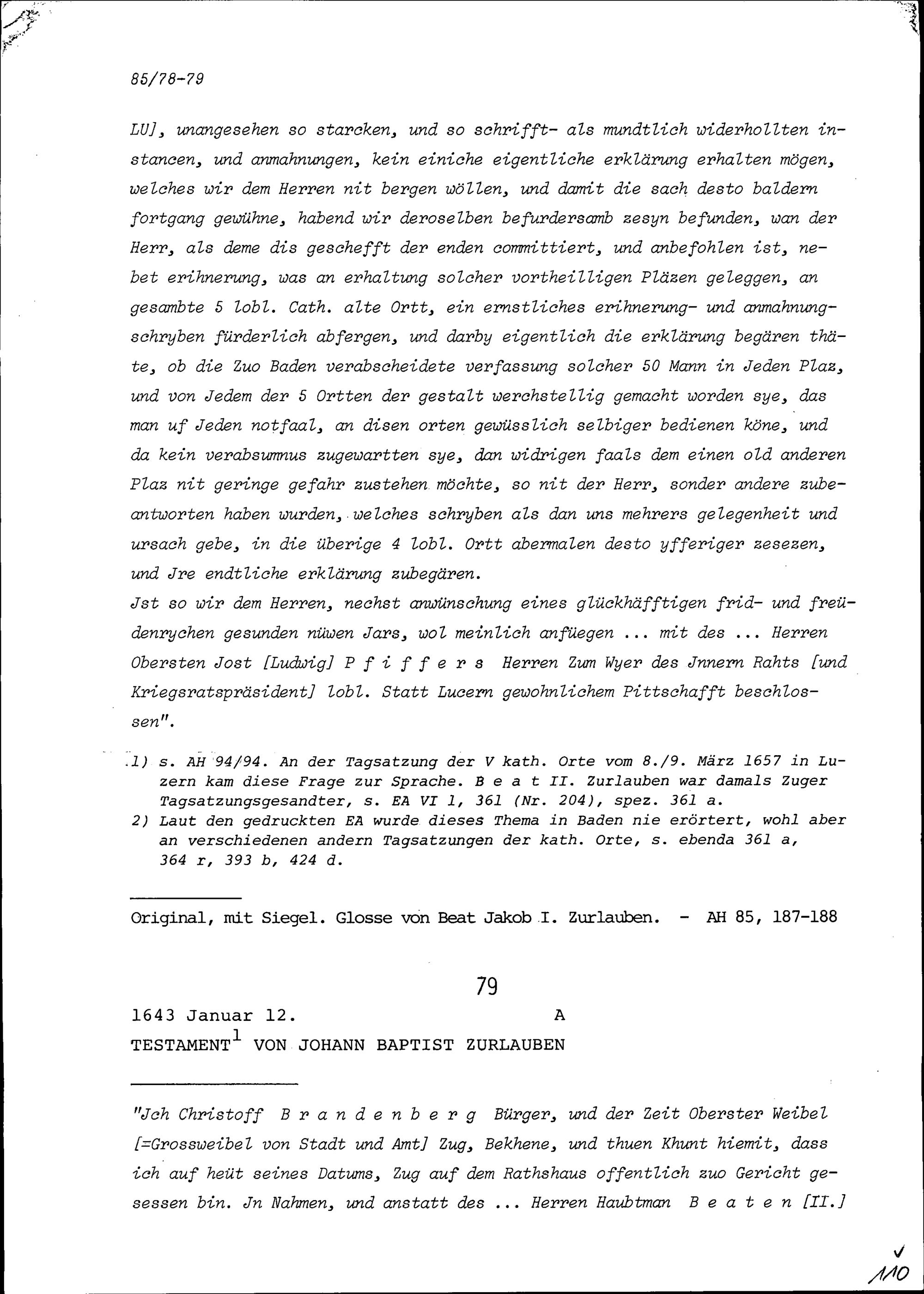 Testament von Johann Baptist Zurlauben