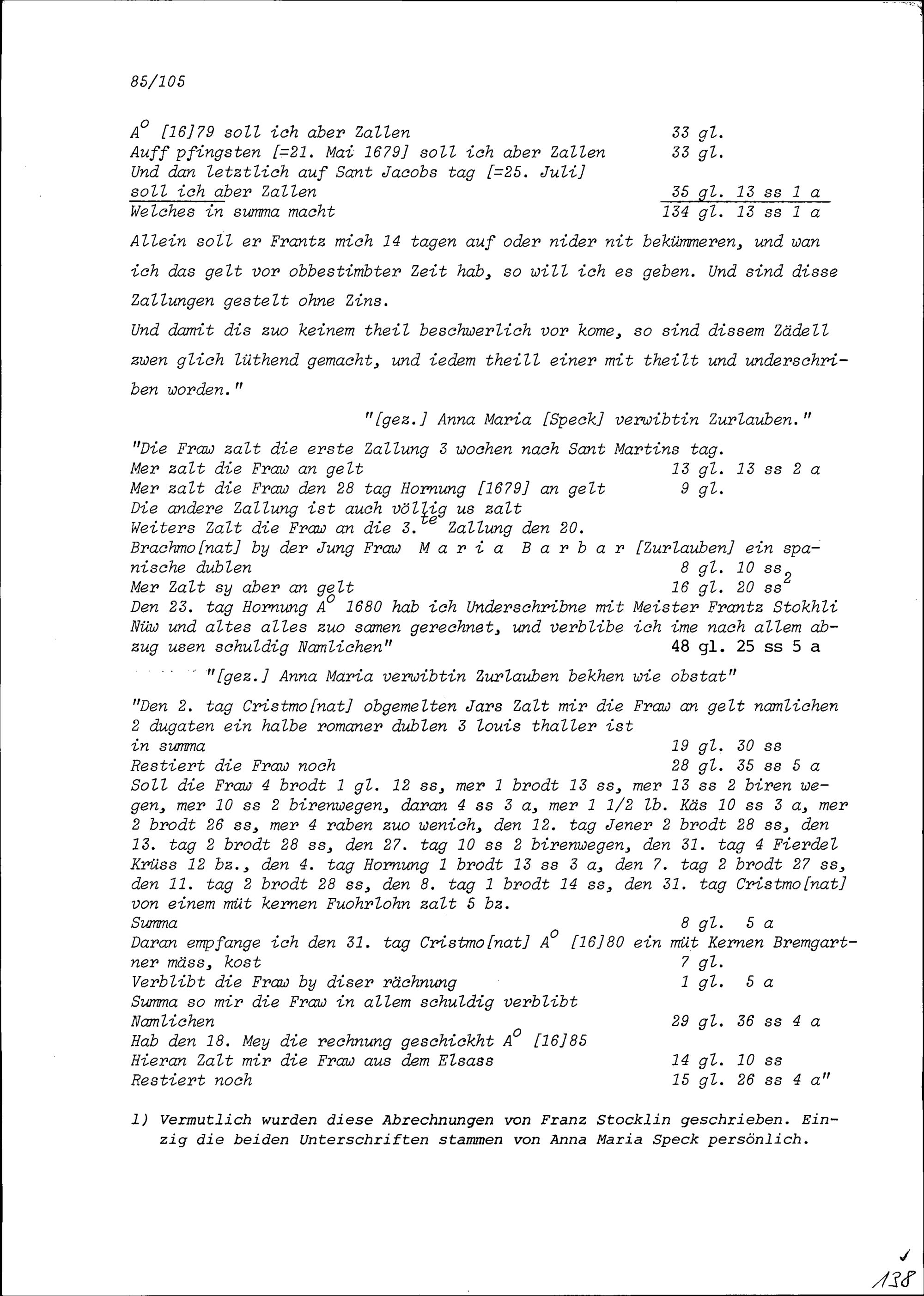 Abrechnungen von Anna Maria Speck, Witwe von Heinrich II. Zurlauben mit Franz Stocklin, Bäcker von Zug