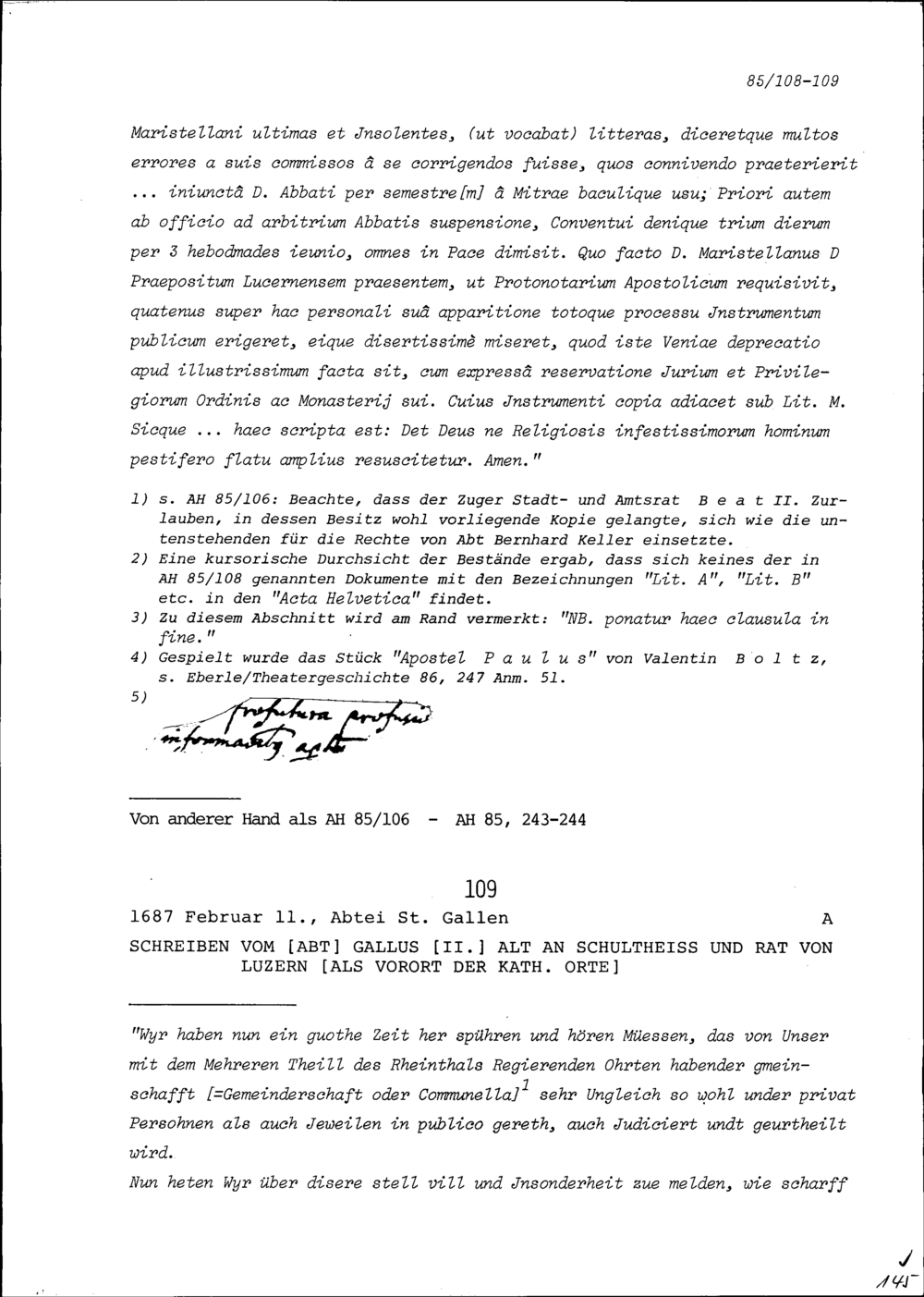 Schreiben von Gallus II. Alt, Fürstabt von Sankt Gallen, an Schultheiss und Rat Luzern, Vorort der Katholischen Orte