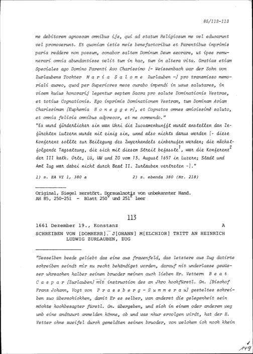 Schreiben von Johann Melchior Tritt, Domherr, an Heinrich Ludwig Zurlauben, Zug