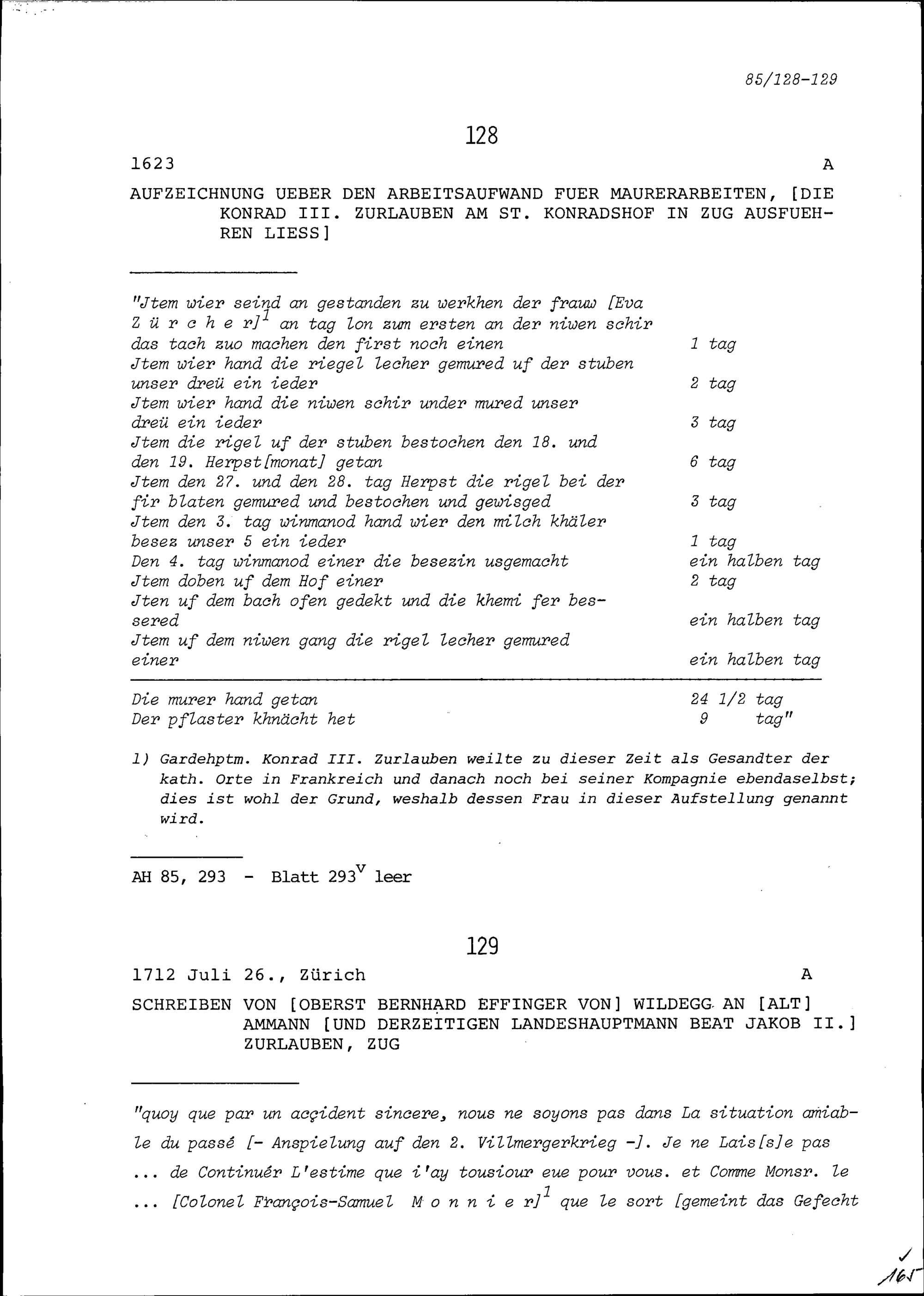 Notiz von Konrad III. Zurlauben über den Arbeitsaufwand für Maurerarbeiten am Sankt Konradshof in Zug