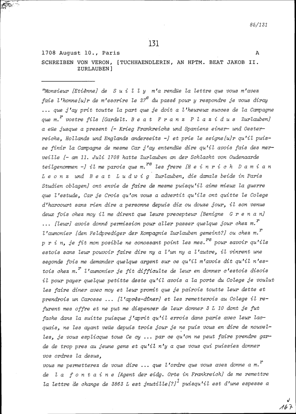 Schreiben von NN Veron, Tuchhändlerin, an Beat Jakob II. Zurlauben, Hauptmann