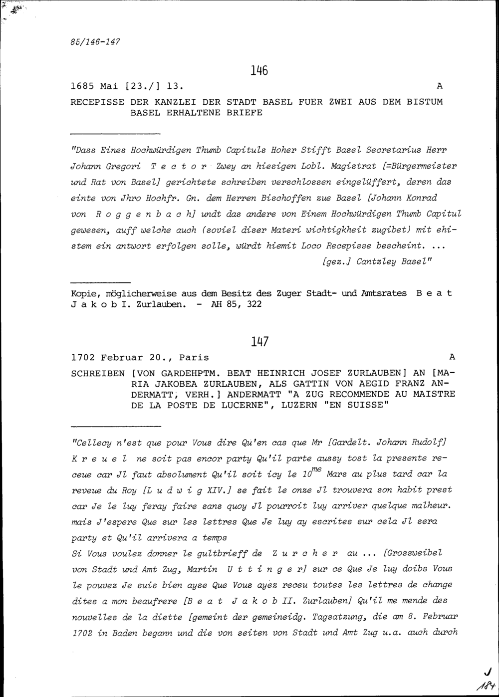 Bestätigung der Kanzlei der Stadt Basel für zwei aus dem Bistum Basel erhaltene ...