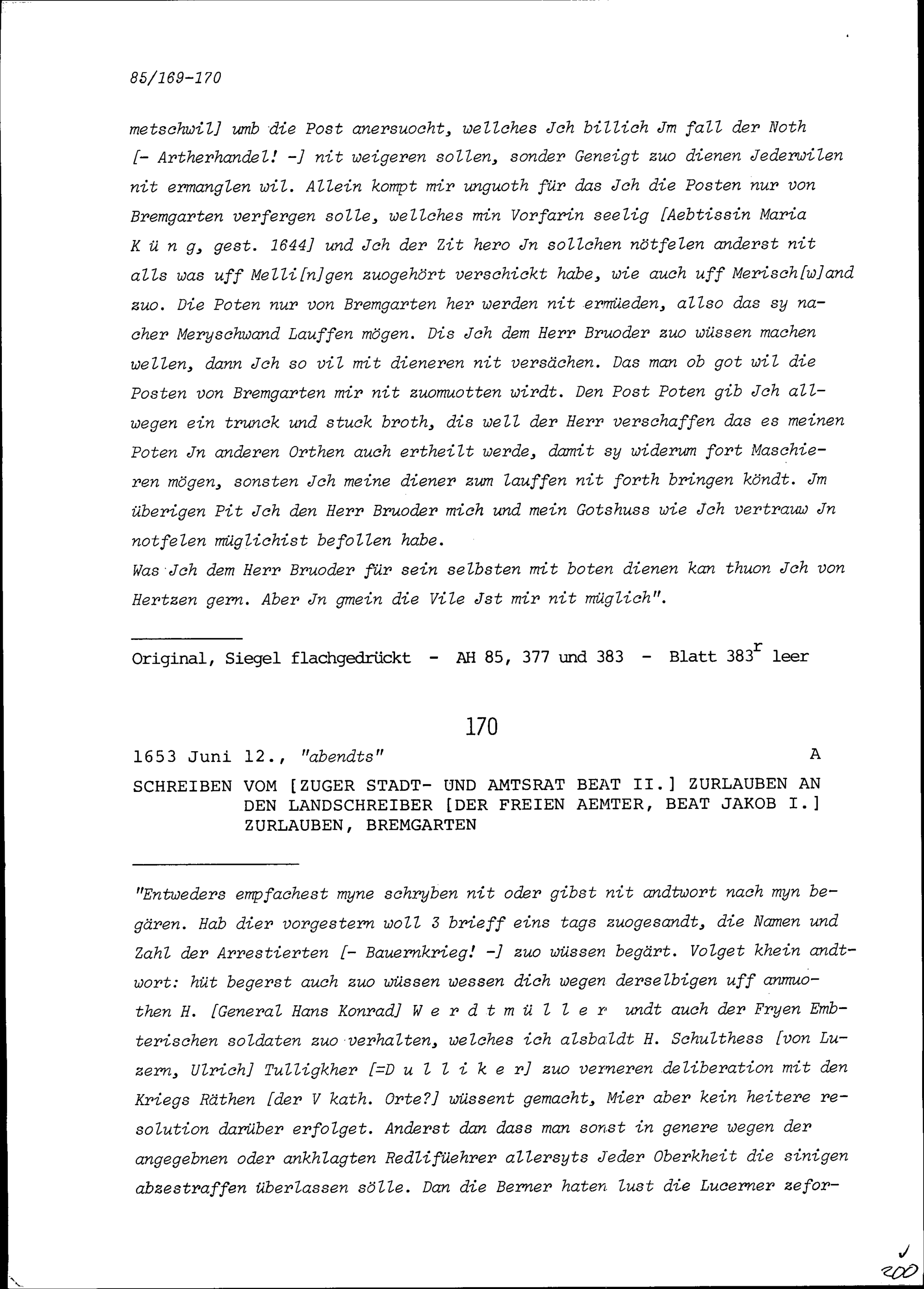 Schreiben von Beat II. Zurlauben, Stadt- und Amtrat Zug, an Beat Jakob I. Zurlauben, Landschreiber der Freien Ämter, Bremgarten