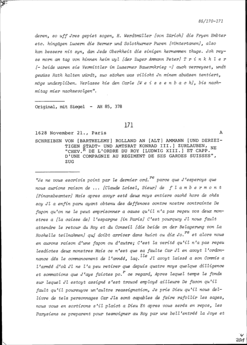 Schreiben von Barthélémy Rolland an Konrad III. Zurlauben, Hauptmann, Altammann und Stadt- und Amtrat, Zug