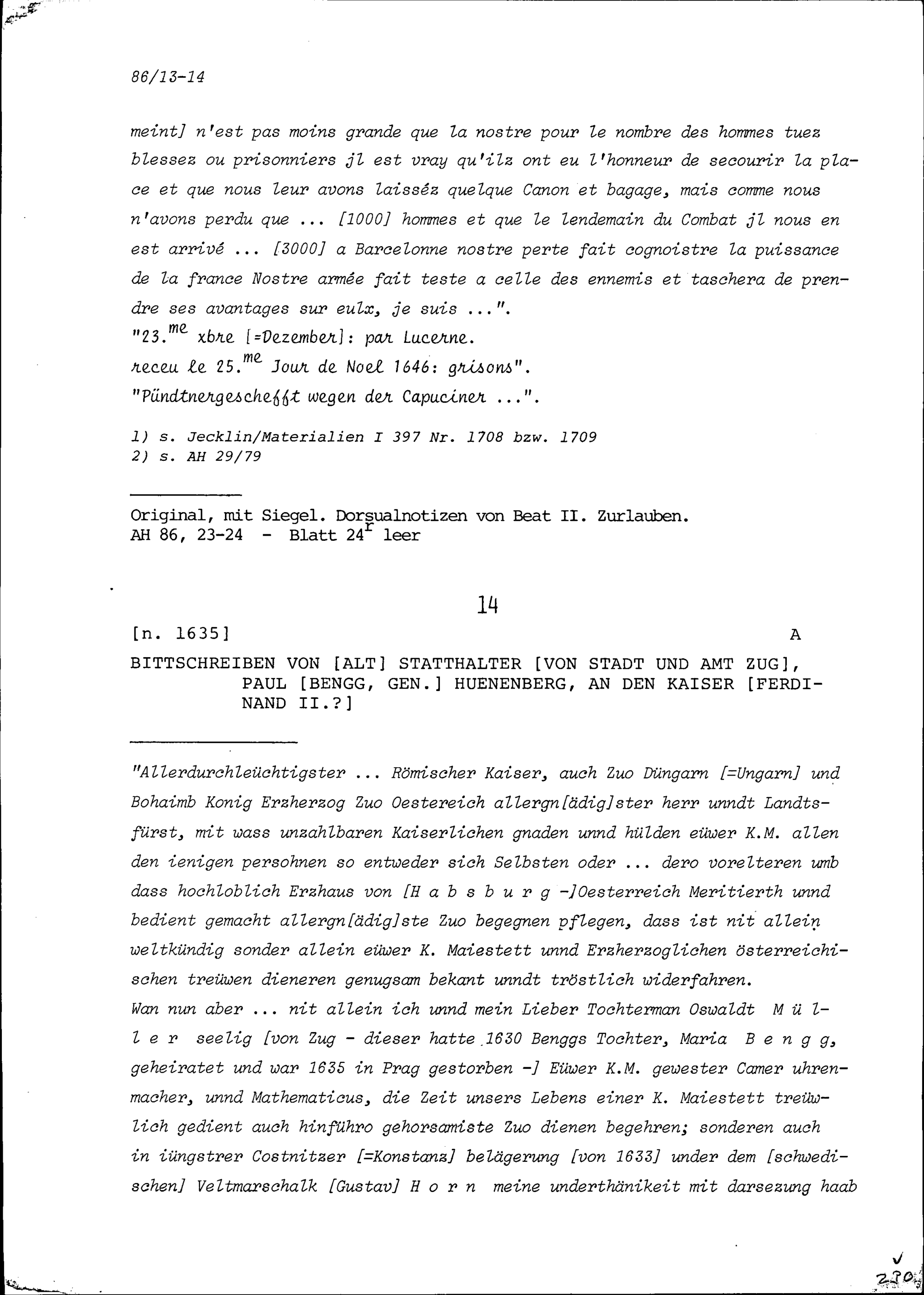 Bittschreiben von Paul Bengg, genannt Hünenberg, Altstatthalter von Stadt und Amt Zug, an Ferdinand II., Kaiser