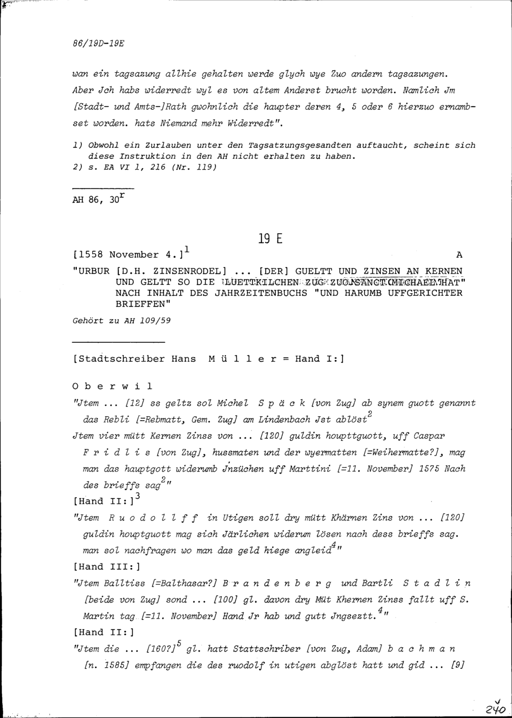 Zinsrodel der Kirche Sankt Michael, Zug, nach dem Jahrzeitenbuch