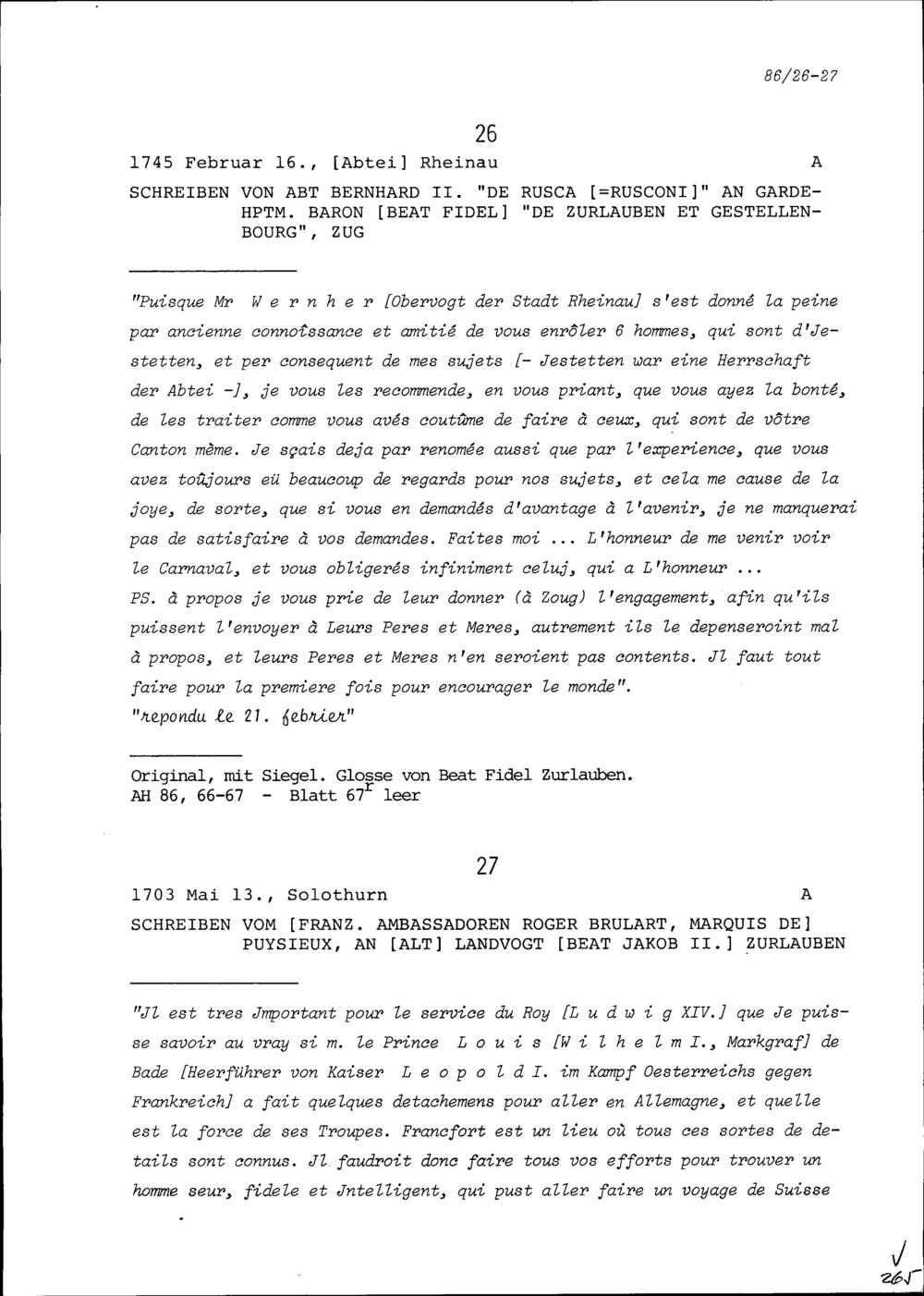 Schreiben von Bernhard II. Rusconi, Abt, an Beat Fidel Zurlauben, Gardehauptmann,...