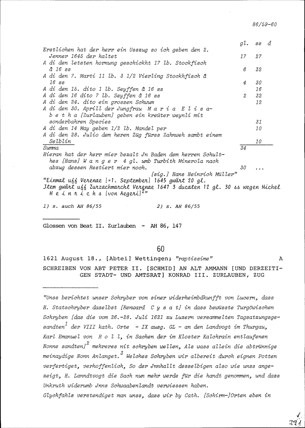 Schreiben von Peter II. Schmid, Abt von Wettingen, an Konrad III. Zurlauben, Altammann...