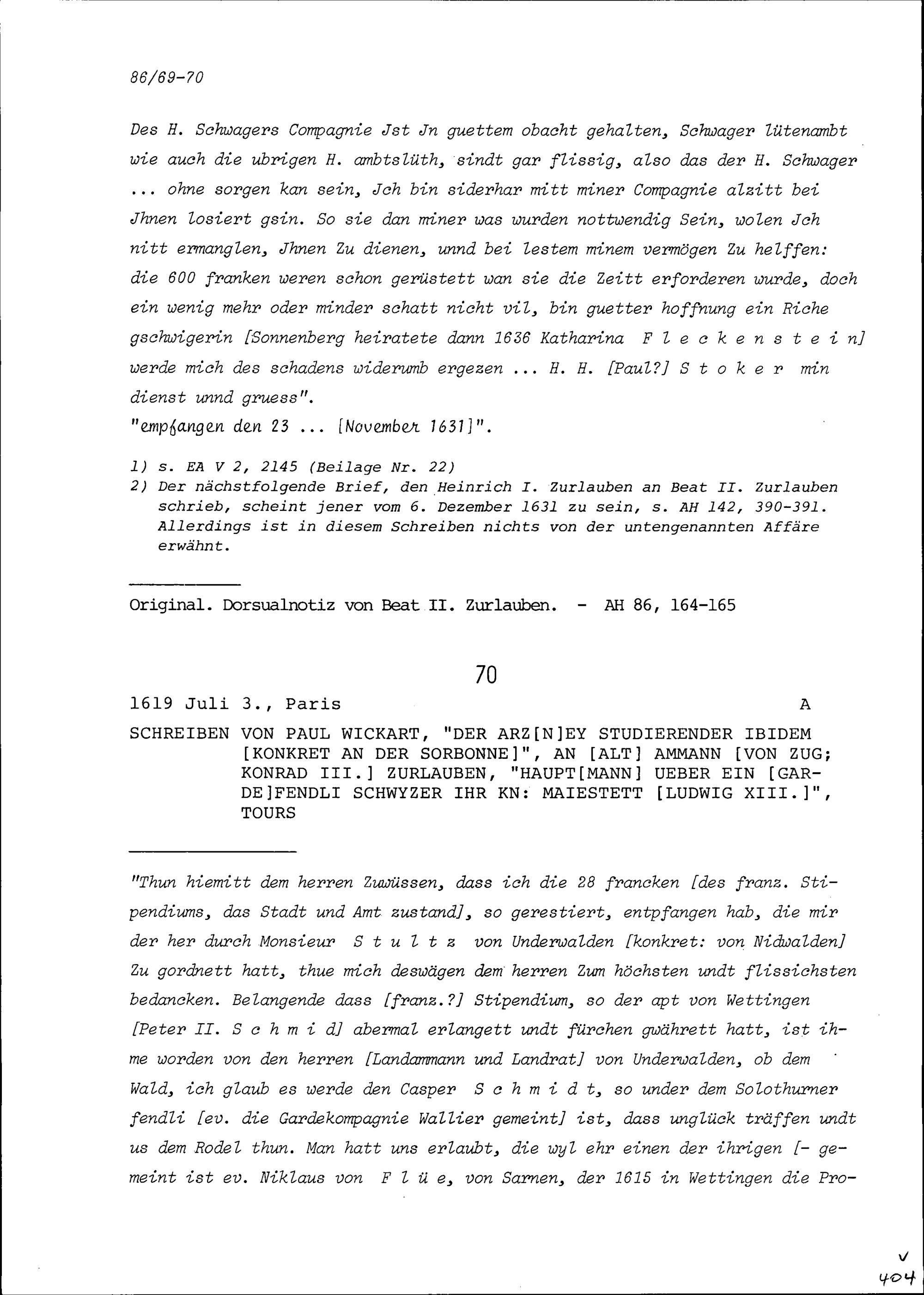 Schreiben von Paul Wickart, Medizinstudent studierender an der Sorbonne, an Konrad III. Zurlauben, Altammann und Hauptmann, Tours
