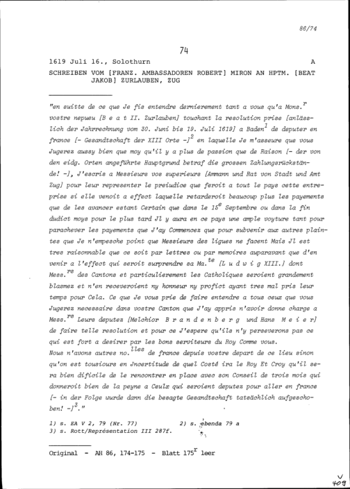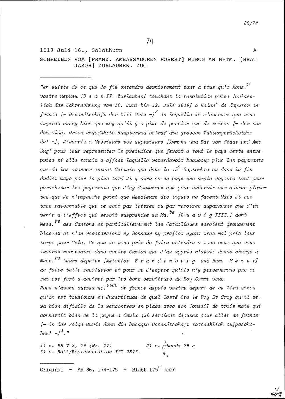 Schreiben von Robert Miron, Ambassador von Frankreich, an Beat Jakob Zurlauben, Hauptmann, Zug