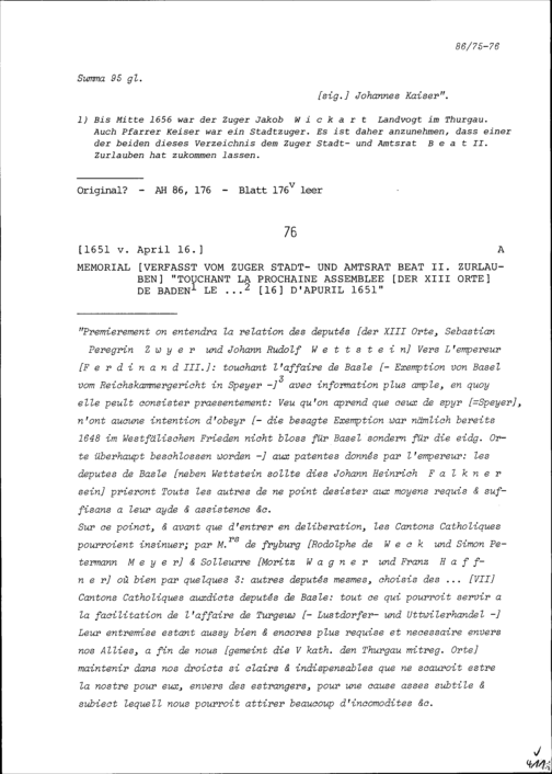 Bericht, verfasst von Beat II. Zurlauben, Stadt- und Amtrat Zug, zur Tagsatzung der Dreizehn Orte in Baden