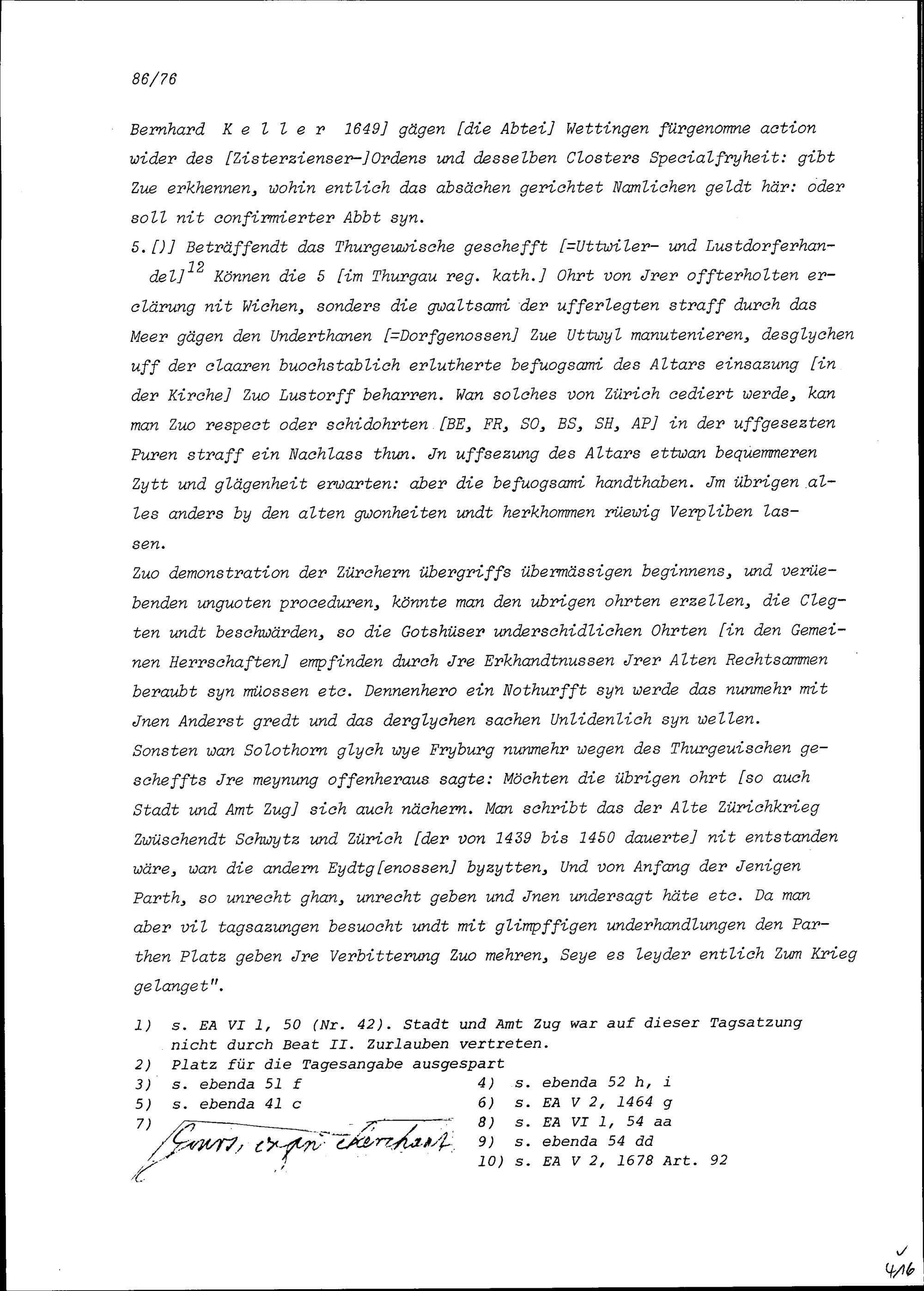 Bericht, verfasst von Beat II. Zurlauben, Stadt- und Amtrat Zug, zur Tagsatzung der Dreizehn Orte in Baden