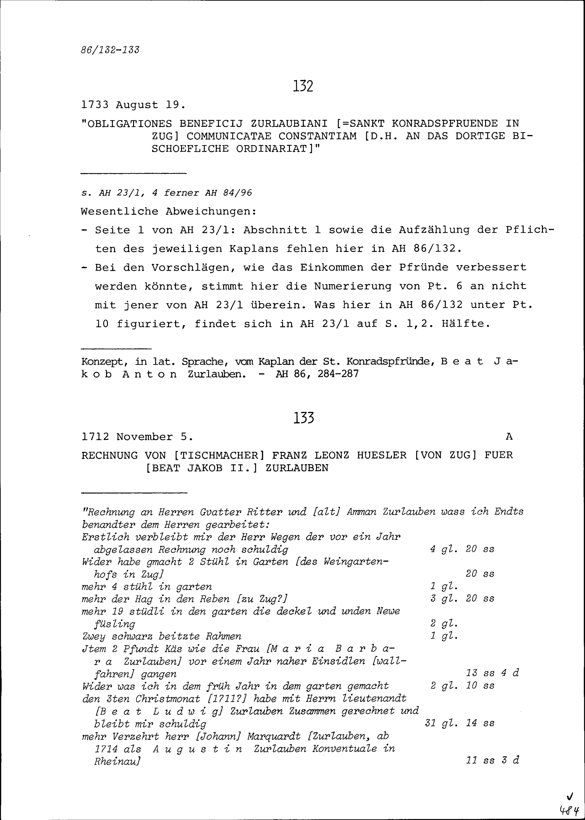 Verpflichtungen des zurlaubenschen Benefiziats, der Konradspfrund in Zug an das bischöfliche...